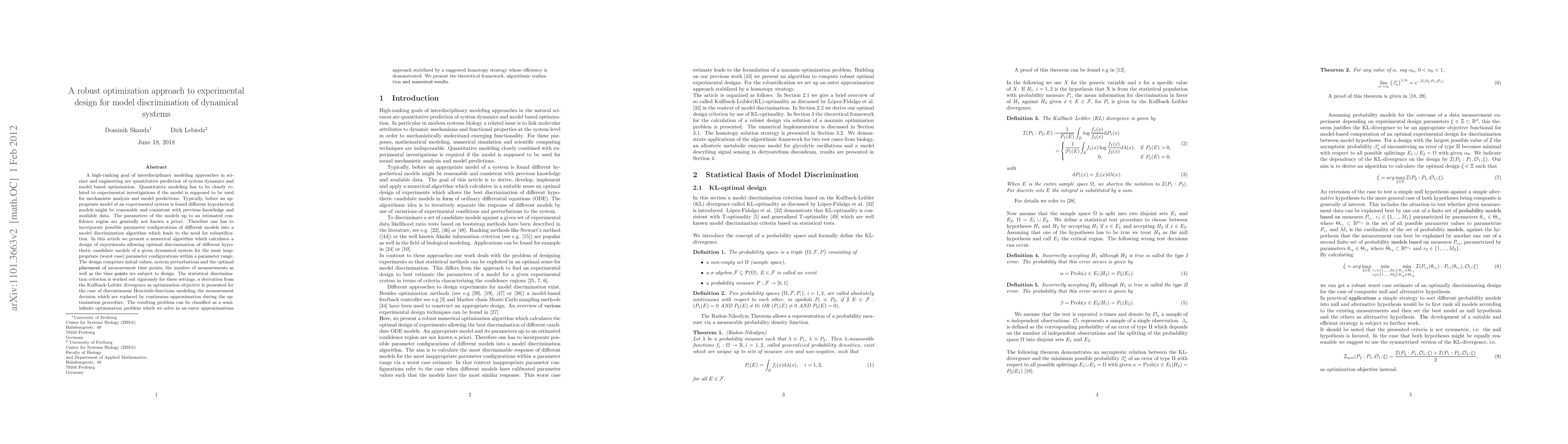 A high-ranking goal of interdisciplinary modeling approaches in the natural sciences are quantitative prediction of system dynamics and model based optimization. For this purpose, mathematical modeling, numerical simulation and scientific computing techniques are indispensable. Quantitative modeling closely combined with experimental investigations is required if the model is supposed to be used for sound mechanistic analysis and model predictions. Typically, before an appropriate model of a experimental system is found different hypothetical models might be reasonable and consistent with previous knowledge and available data. The parameters of the model up to an estimated confidence region are generally not known a priori. Therefore one has to incorporate possible parameter configurations of different models into a model discrimination algorithm. In this article we present a numerical algorithm which calculates a design of experiments which allows an optimal discrimination of different hypothetic candidate models of a given dynamic system for the most inappropriate parameter configurations within a parameter range via a worst case estimate. The design criterion comprises optimal measurement time points. The used criterion is derived from the Kullback-Leibler divergence. The underlying optimization problem can be classified as a semi infinite optimization problem which we solve in an outer approximation approach stabilized by a homotopy strategy. We present the theoretical framework as well as the numerical algorithmic realization.