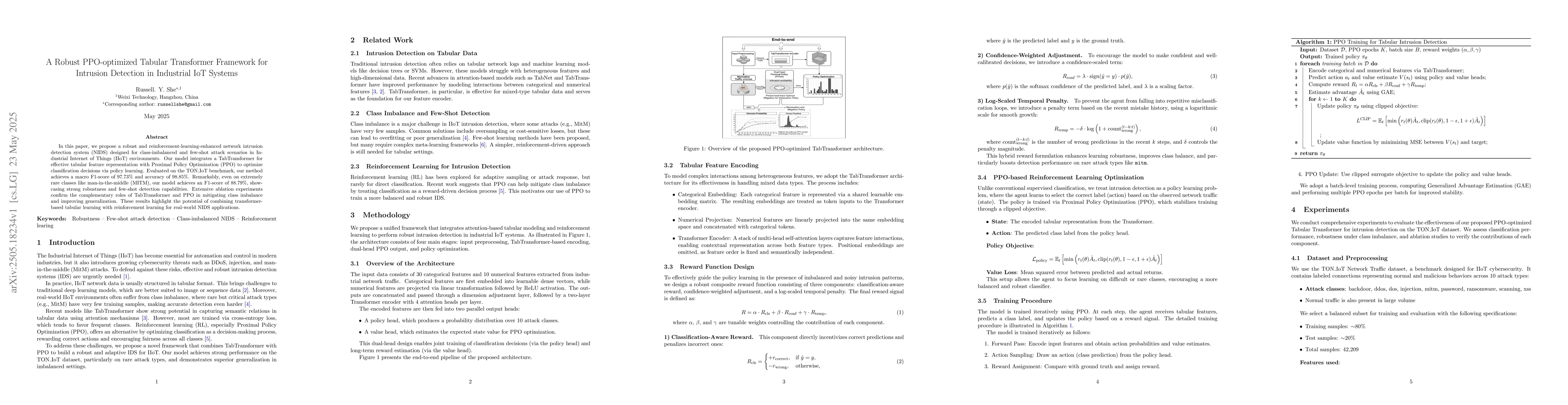The research proposes a NIDS using a TabTransformer for tabular feature representation combined with Proximal Policy Optimization (PPO) for policy learning, aiming to address class-imbalanced and few-shot attack scenarios in IIoT environments.
