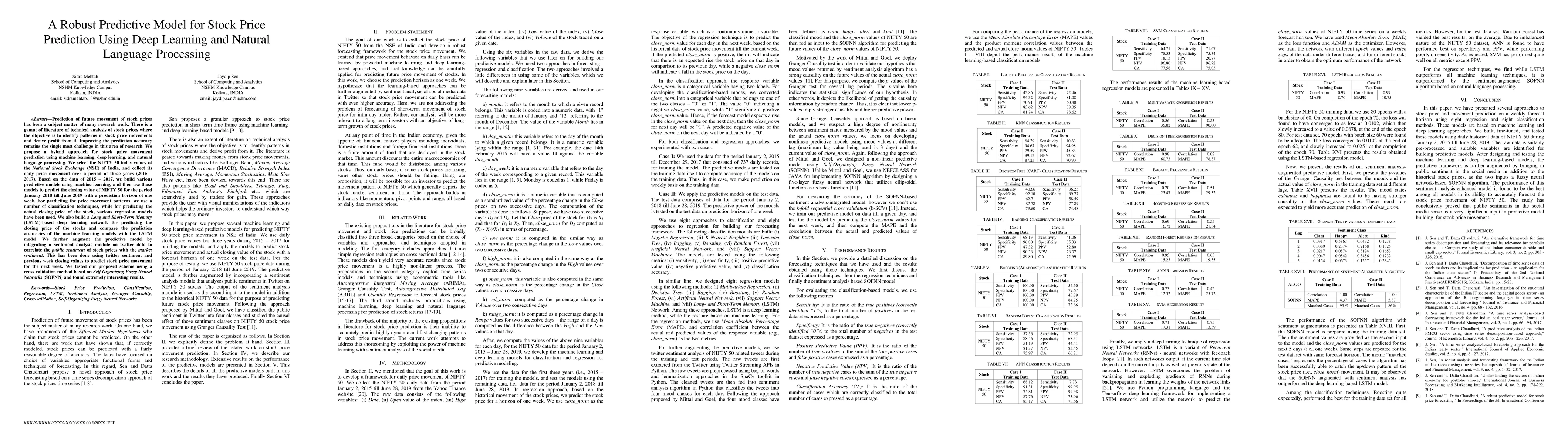 This paper proposes a robust predictive model for stock price prediction using deep learning and natural language processing. It combines machine learning, deep learning (LSTM), and sentiment analysis of Twitter data to predict the NIFTY 50 index's future price movements, achieving improved accuracy over traditional machine learning models.