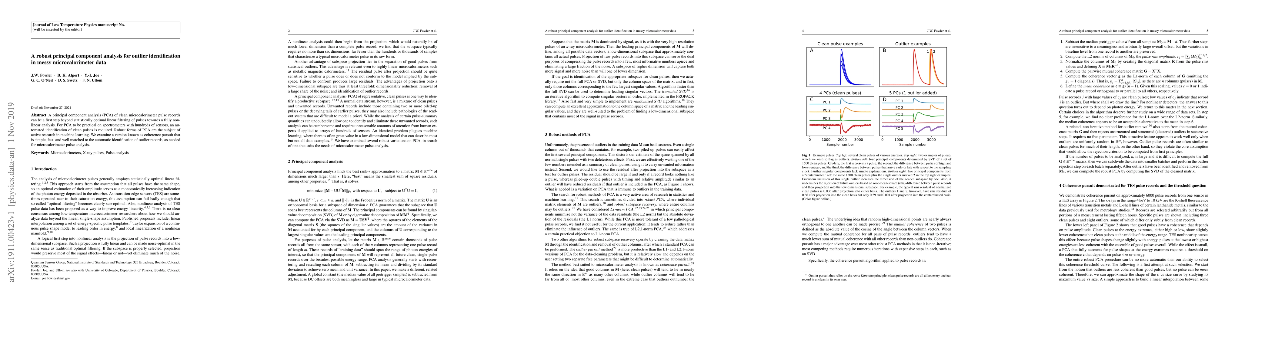 This paper explores a robust version of principal component analysis (PCA) called coherence pursuit for identifying outliers in noisy microcalorimeter data. The method aims to automate the identification of clean pulses, facilitating non-linear analysis in spectrometers with numerous sensors.