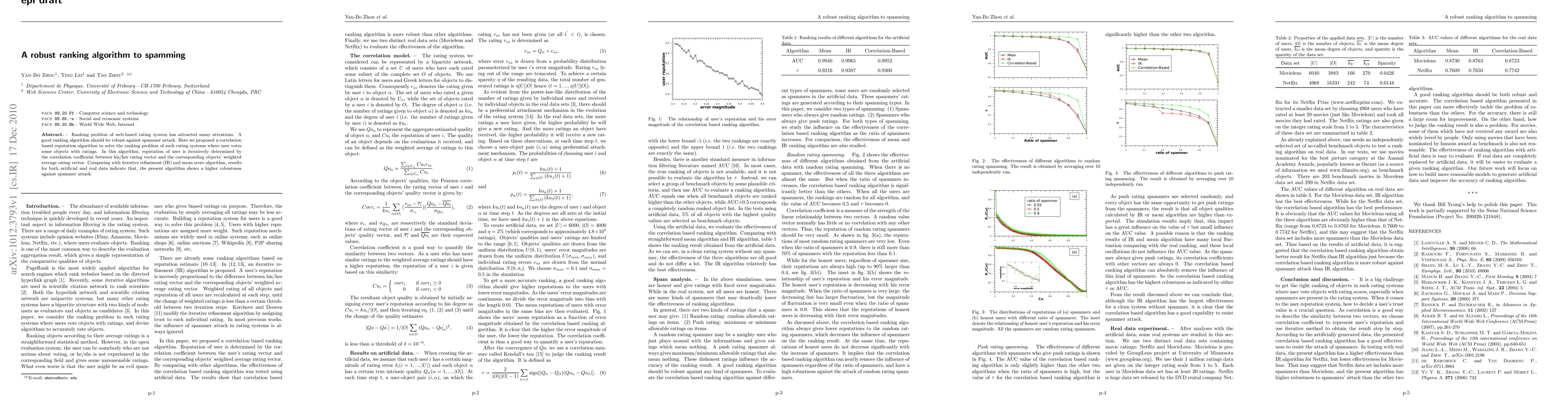 This paper proposes a correlation-based reputation algorithm to enhance the robustness of web-based rating systems against spammer attacks. The algorithm iteratively determines user reputation through correlation coefficients between user ratings and object average ratings, demonstrating higher robustness compared to iterative refinement and mean score methods.