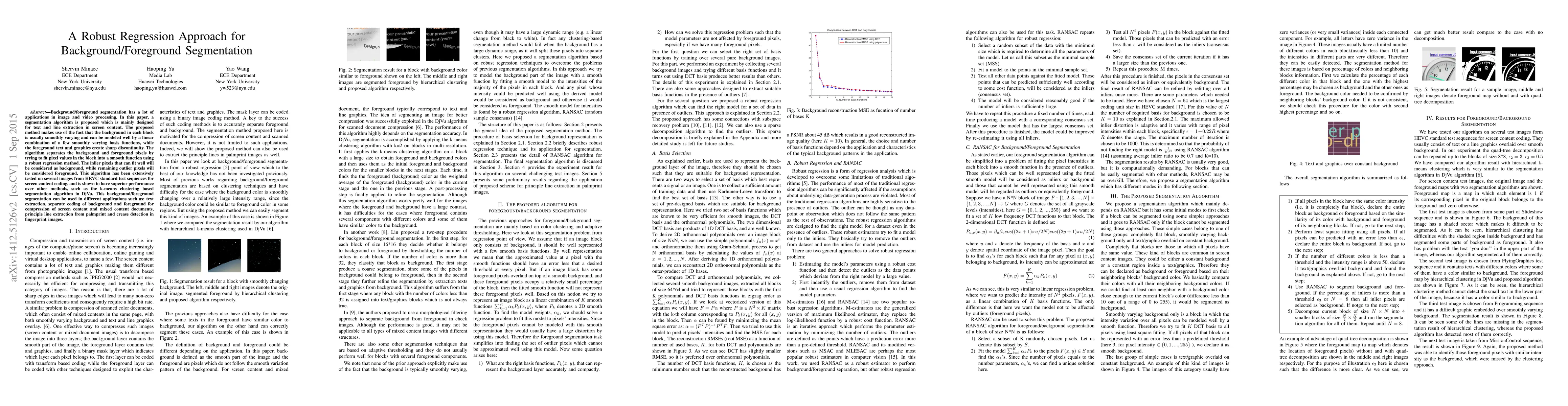 This paper proposes a robust regression approach for background/foreground segmentation, effectively separating smoothly varying background from sharp discontinuities in foreground text and graphics. The method outperforms k-means clustering, with applications in text extraction, screen content coding, and line detection in biometric images.