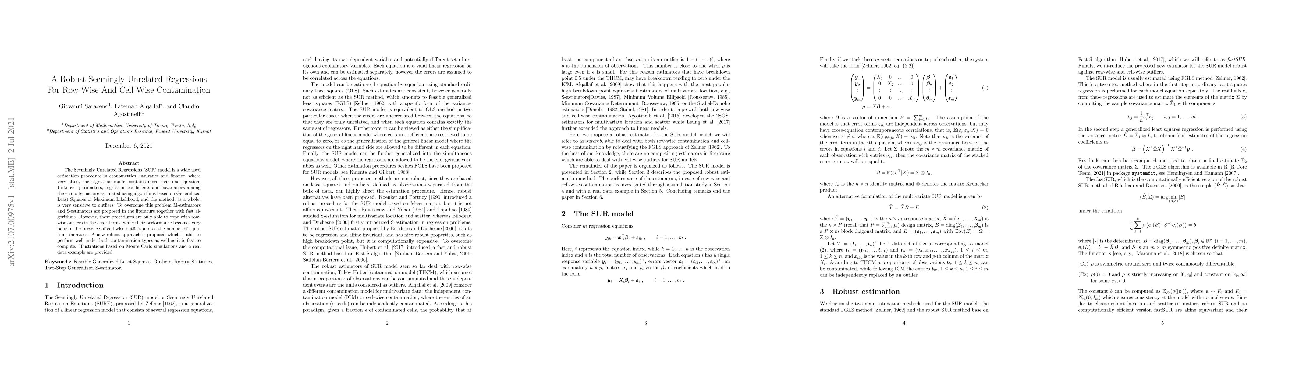 The Seemingly Unrelated Regressions (SUR) model is a wide used estimation procedure in econometrics, insurance and finance, where very often, the regression model contains more than one equation. Unknown parameters, regression coefficients and covariances among the errors terms, are estimated using algorithms based on Generalized Least Squares or Maximum Likelihood, and the method, as a whole, is very sensitive to outliers. To overcome this problem M-estimators and S-estimators are proposed in the literature together with fast algorithms. However, these procedures are only able to cope with row-wise outliers in the error terms, while their performance becomes very poor in the presence of cell-wise outliers and as the number of equations increases. A new robust approach is proposed which is able to perform well under both contamination types as well as it is fast to compute. Illustrations based on Monte Carlo simulations and a real data example are provided.