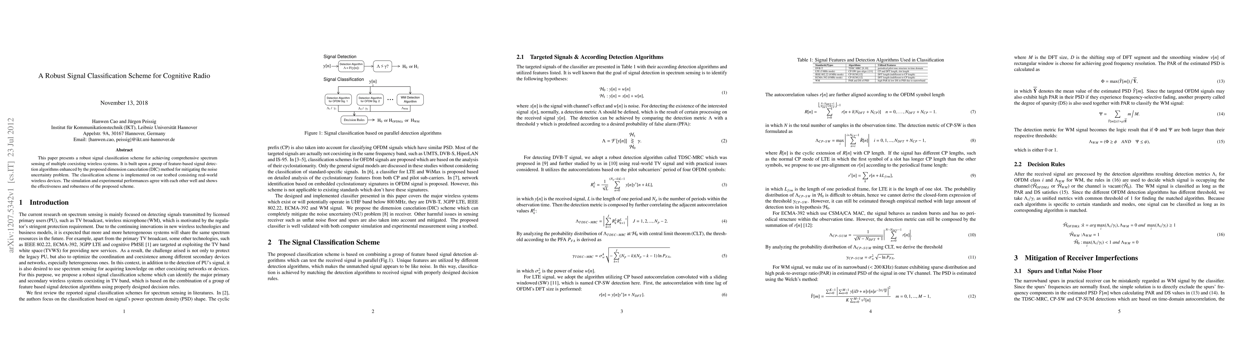 This paper introduces a robust signal classification scheme for cognitive radio, utilizing feature-based detection algorithms enhanced by a dimension cancellation method to mitigate noise uncertainty. The scheme's effectiveness and robustness are validated through both simulation and real-world device testing.