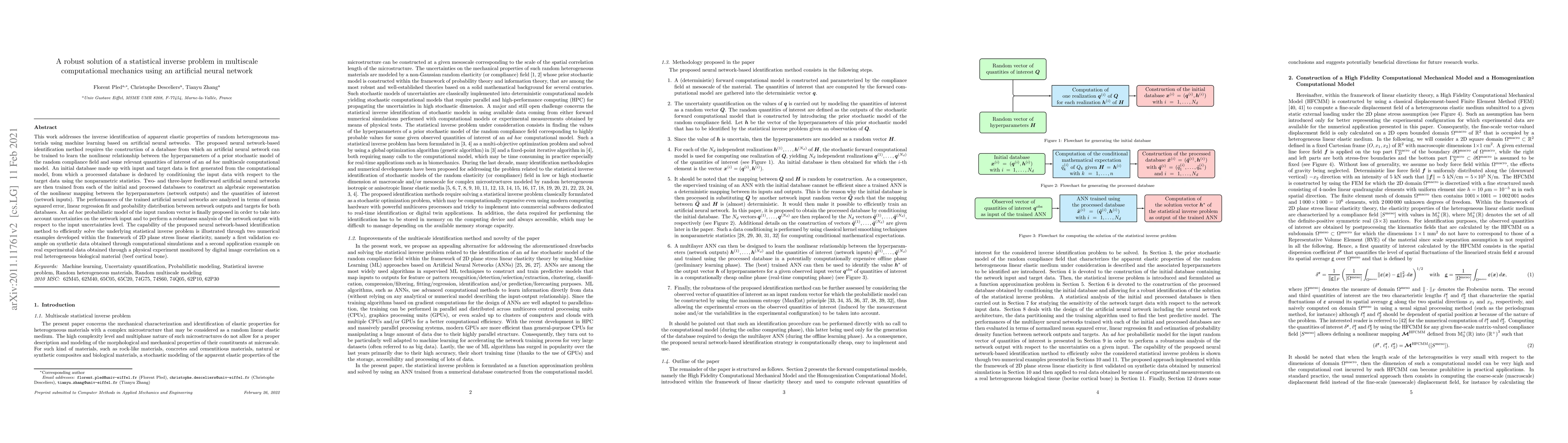 This work addresses the inverse identification of apparent elastic properties of random heterogeneous materials using machine learning based on artificial neural networks. The proposed neural network-based identification method requires the construction of a database from which an artificial neural network can be trained to learn the nonlinear relationship between the hyperparameters of a prior stochastic model of the random compliance field and some relevant quantities of interest of an ad hoc multiscale computational model. An initial database made up with input and target data is first generated from the computational model, from which a processed database is deduced by conditioning the input data with respect to the target data using the nonparametric statistics. Two-and three-layer feedforward artificial neural networks are then trained from each of the initial and processed databases to construct an algebraic representation of the nonlinear mapping between the hyperparameters (network outputs) and the quantities of interest (network inputs). The performances of the trained artificial neural networks are analyzed in terms of mean squared error, linear regression fit and probability distribution between network outputs and targets for both databases. An ad hoc probabilistic model of the input random vector is finally proposed in order to take into account uncertainties on the network input and to perform a robustness analysis of the network output with respect to the input uncertainties level. The capability of the proposed neural network-based identification method to efficiently solve the underlying statistical inverse problem is illustrated through two numerical examples developed within the framework of 2D plane stress linear elasticity, namely a first validation example on synthetic data obtained through computational simulations and a second application example on real experimental data obtained through a physical experiment monitored by digital image correlation on a real heterogeneous biological material (beef cortical bone).
