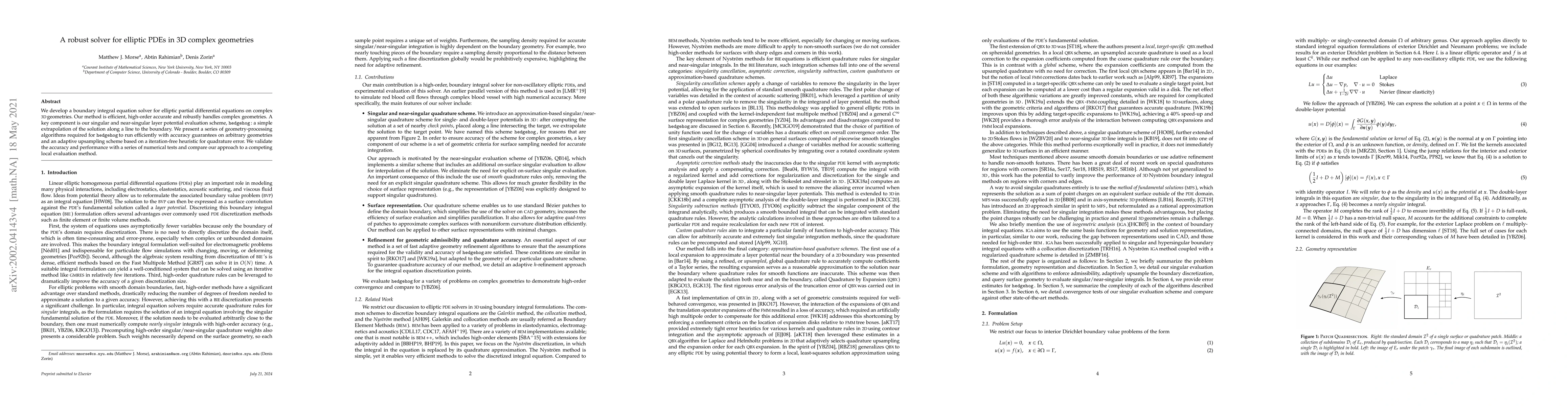This paper presents a robust solver for elliptic PDEs in 3D complex geometries using boundary integral equations. The method employs a high-order accurate singular layer potential evaluation scheme, \qbkix, and includes geometry-processing algorithms and an adaptive upsampling scheme for efficient performance.