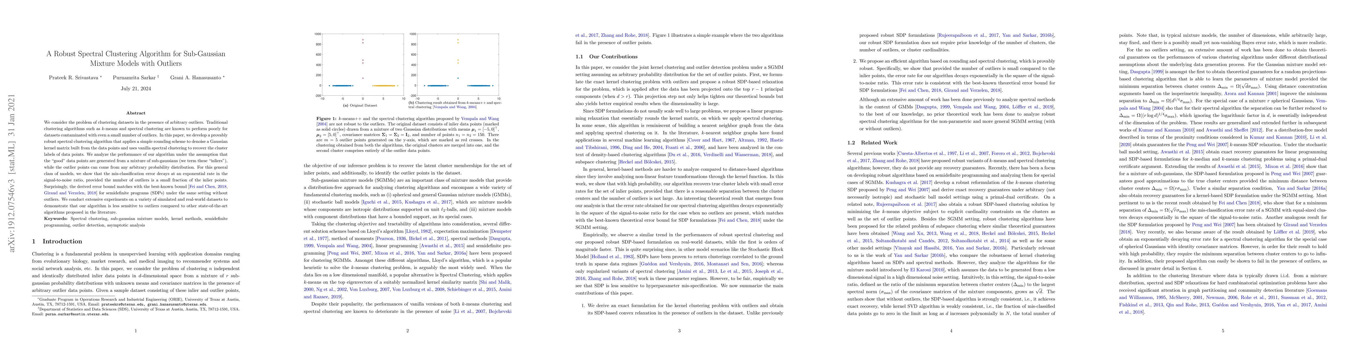 This paper presents a robust spectral clustering algorithm designed to handle datasets with outliers, achieving provable performance guarantees under sub-Gaussian mixture models. The algorithm denoises a Gaussian kernel matrix and uses spectral clustering, showing exponential decay in misclassification error relative to the signal-to-noise ratio, and performs competitively against other state-of-the-art methods in experiments.