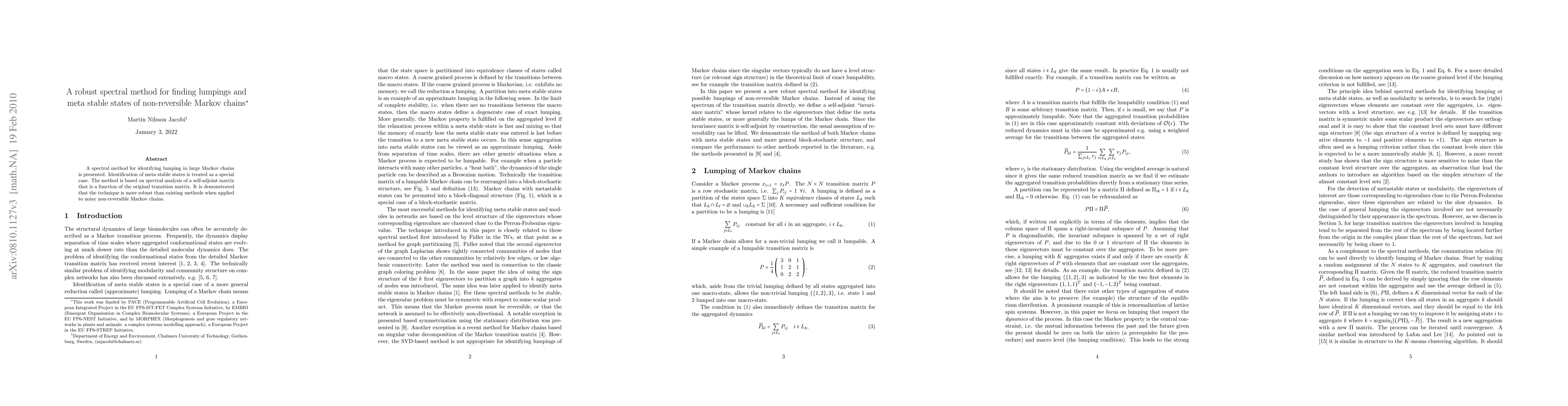 A spectral method for identifying lumping in large Markov chains is presented. Identification of meta stable states is treated as a special case. The method is based on spectral analysis of a self-adjoint matrix that is a function of the original transition matrix. It is demonstrated that the technique is more robust than existing methods when applied to noisy non-reversible Markov chains.