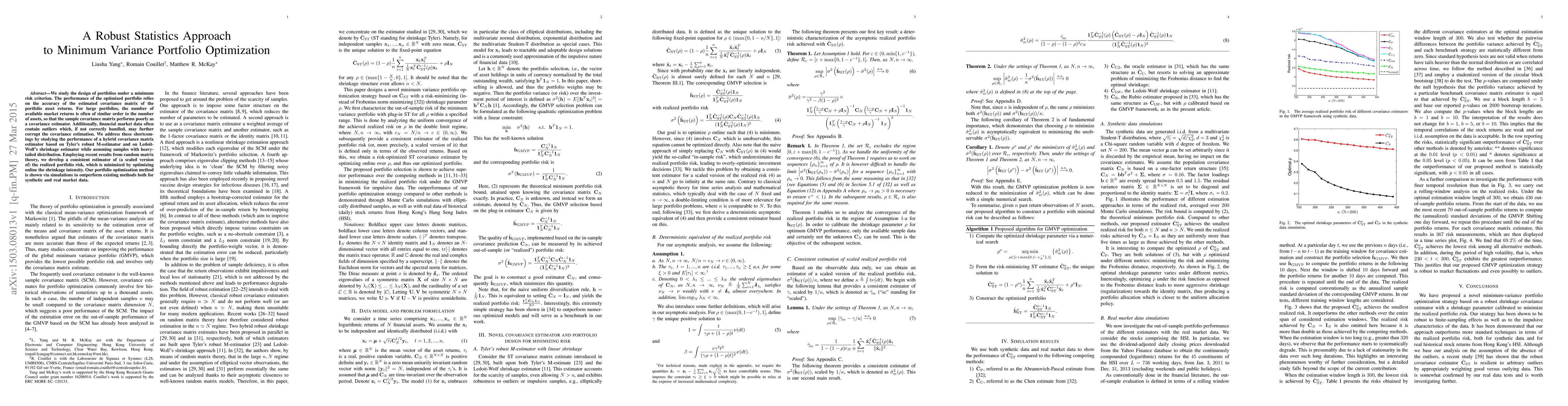 This paper proposes a robust statistics approach to optimize minimum variance portfolios using a hybrid covariance matrix estimator that combines Tyler's robust M-estimator and Ledoit-Wolf's shrinkage estimator. The method is shown to outperform existing techniques through simulations on both synthetic and real market data.