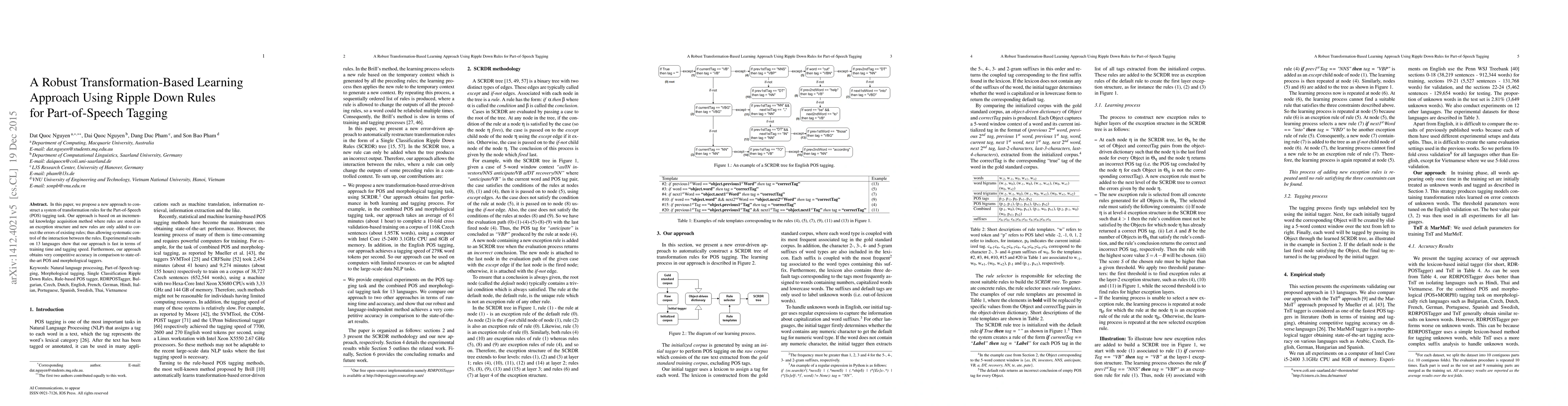 This paper introduces a transformation-based learning approach using Ripple Down rules for Part-of-Speech tagging, demonstrating fast training and tagging speeds, and competitive accuracy across 13 languages. The method incrementally adds rules to correct errors, ensuring systematic control over rule interactions.