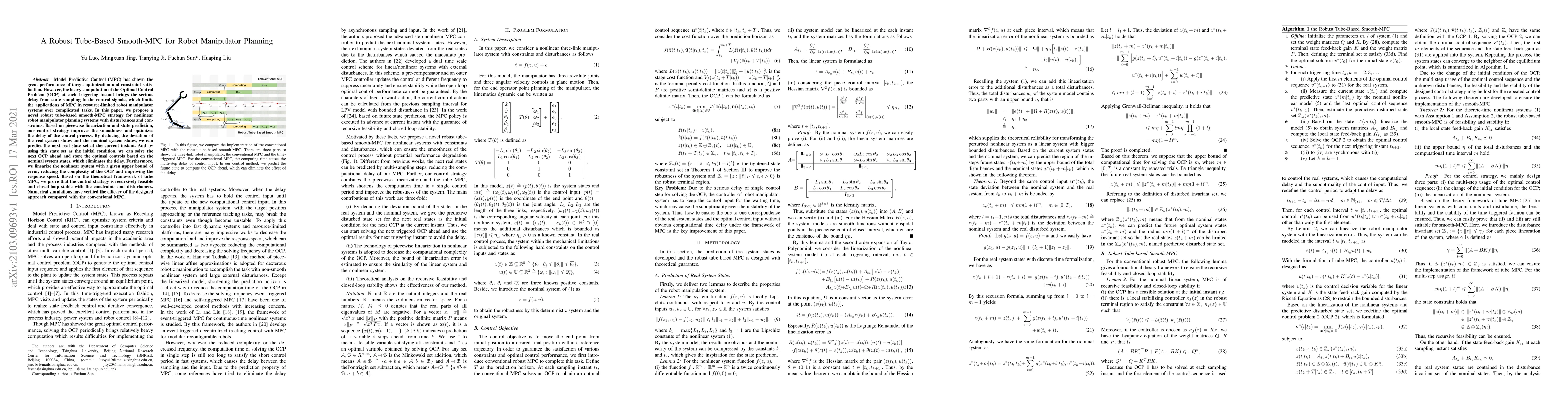 Model Predictive Control (MPC) has shown the great performance of target optimization and constraint satisfaction. However, the heavy computation of the Optimal Control Problem (OCP) at each triggering instant brings the serious delay from state sampling to the control signals, which limits the applications of MPC in resource-limited robot manipulator systems over complicated tasks. In this paper, we propose a novel robust tube-based smooth-MPC strategy for nonlinear robot manipulator planning systems with disturbances and constraints. Based on piecewise linearization and state prediction, our control strategy improves the smoothness and optimizes the delay of the control process. By deducing the deviation of the real system states and the nominal system states, we can predict the next real state set at the current instant. And by using this state set as the initial condition, we can solve the next OCP ahead and store the optimal controls based on the nominal system states, which eliminates the delay. Furthermore, we linearize the nonlinear system with a given upper bound of error, reducing the complexity of the OCP and improving the response speed. Based on the theoretical framework of tube MPC, we prove that the control strategy is recursively feasible and closed-loop stable with the constraints and disturbances. Numerical simulations have verified the efficacy of the designed approach compared with the conventional MPC.