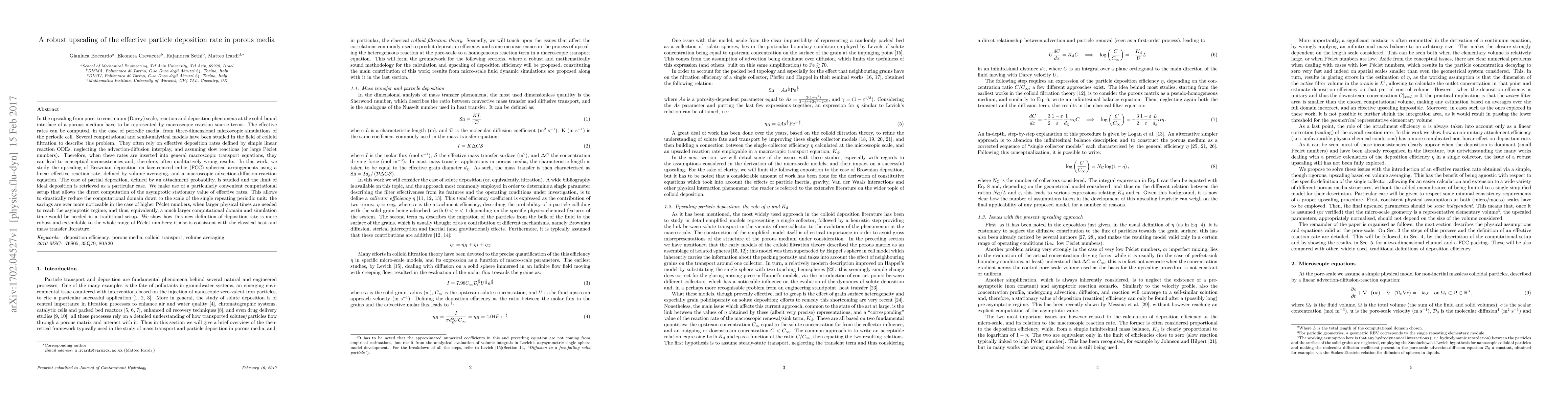 In the upscaling from pore- to continuum (Darcy) scale, reaction and deposition phenomena at the solid-liquid interface of a porous medium have to be represented by macroscopic reaction source terms. The effective rates can be computed, in the case of periodic media, from three-dimensional microscopic simulations of the periodic cell. Several computational and semi-analytical models have been studied in the field of colloid filtration to describe this problem. They often rely on effective deposition rates defined by simple linear reaction ODEs, neglecting the advection-diffusion interplay, and assuming slow reactions. Therefore, when these rates are inserted into general macroscopic transport equations, they can lead to conceptual inconsistencies and, therefore, often qualitatively wrong results. In this work, we study the upscaling of Brownian deposition on face-centred spherical arrangements using a linear effective reaction rate, defined by volume averaging, and a macroscopic advection-diffusion-reaction equation. The case of partial deposition, defined by an attachment probability, is studied and the limit of ideal deposition is retrieved as a particular case. We make use of a particularly convenient computational setup that allows the direct computation of the asymptotic stationary value of effective rates. This allows to drastically reduce the computational domain down to the scale of the single repeating periodic unit: the savings are ever more noticeable in the case of higher Peclet numbers, when larger physical times are needed to reach the asymptotic regime, and thus, equivalently, a much larger computational domain and simulation time would be needed in a traditional setup. We show how this new definition of deposition rate is more robust and extendable to the whole range of P\'eclet numbers; it also is consistent with the classical heat and mass transfer literature.