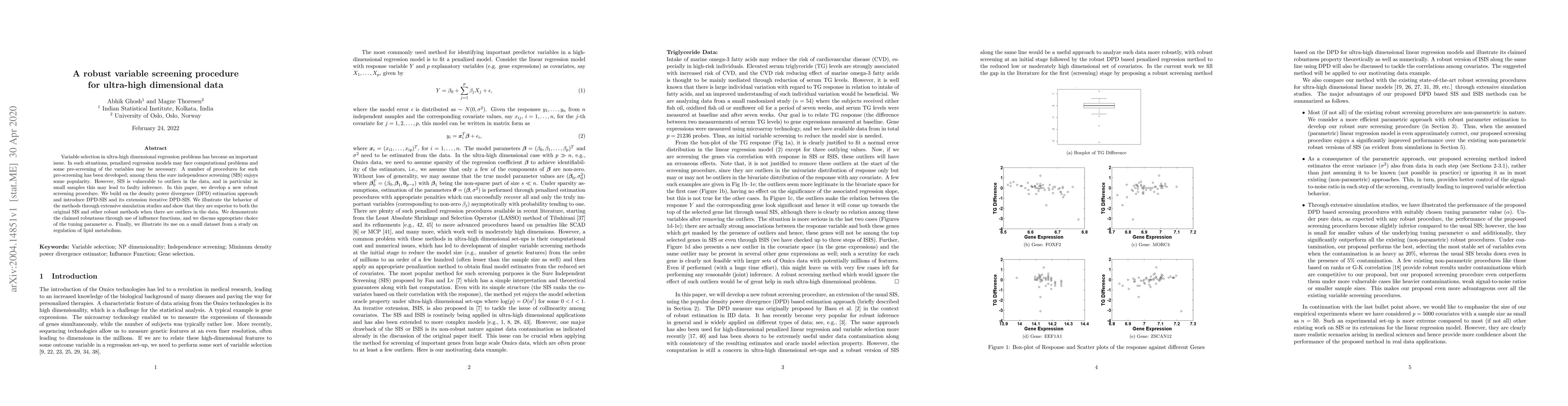 This paper introduces a robust variable screening procedure for ultra-high dimensional data, building on density power divergence to develop DPD-SIS and its iterative extension. The new methods outperform traditional sure independence screening and other robust alternatives, especially in the presence of outliers, as demonstrated through simulations and a small real-data example.