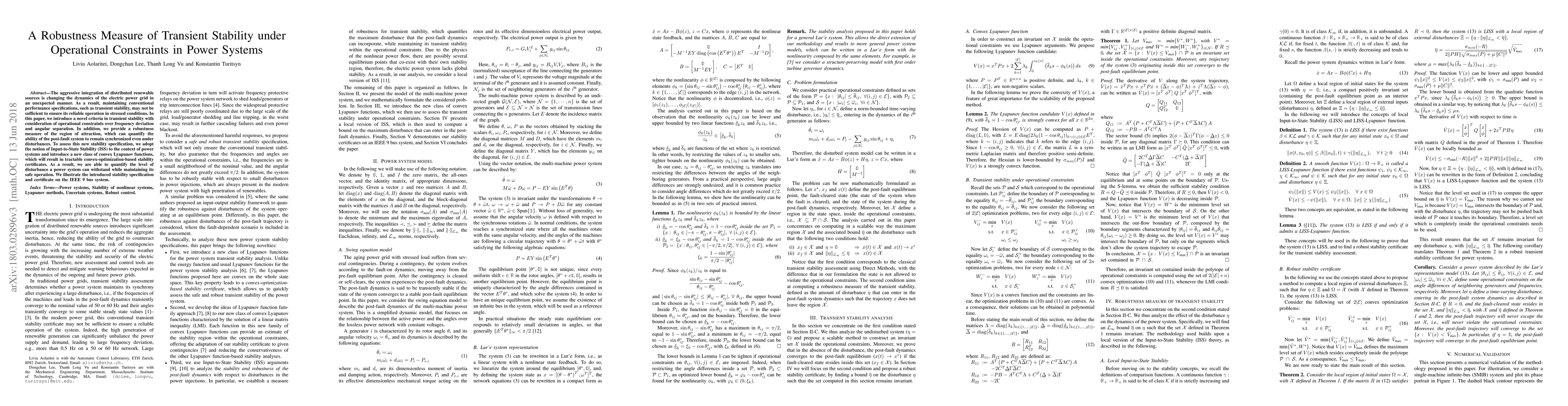 This paper proposes a novel transient stability measure for power systems integrating distributed renewable sources, incorporating operational constraints and a robustness measure based on the region of attraction. It utilizes Input-to-State Stability and convex Lyapunov functions to develop tractable stability certificates, demonstrated on the IEEE 9 bus system.