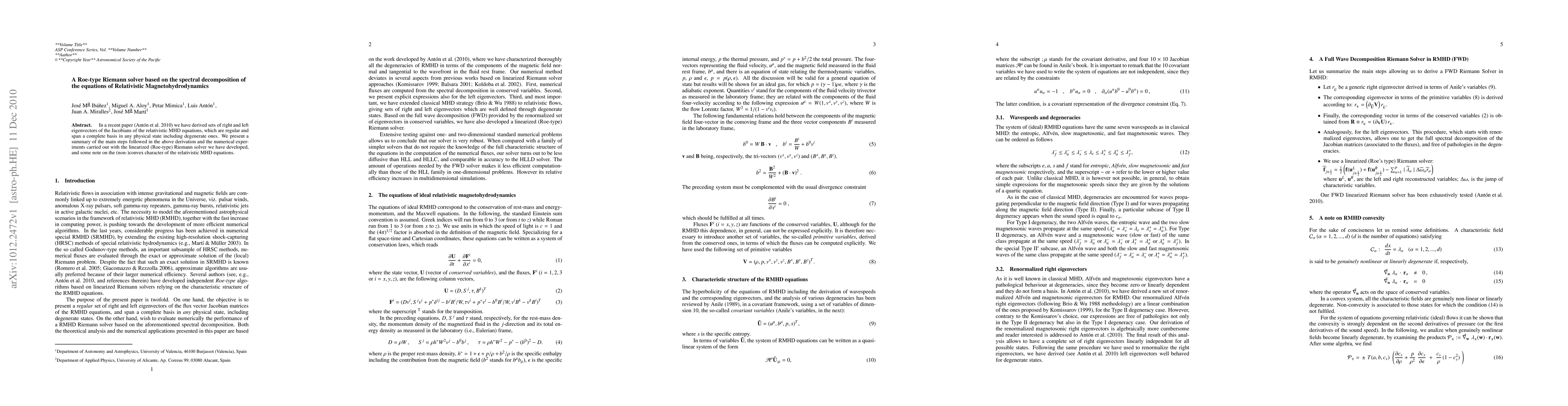 In a recent paper (Ant\'on et al. 2010) we have derived sets of right and left eigenvectors of the Jacobians of the relativistic MHD equations, which are regular and span a complete basis in any physical state including degenerate ones. We present a summary of the main steps followed in the above derivation and the numerical experiments carried out with the linearized (Roe-type) Riemann solver we have developed, and some note on the (non-)convex character of the relativistic MHD equations.