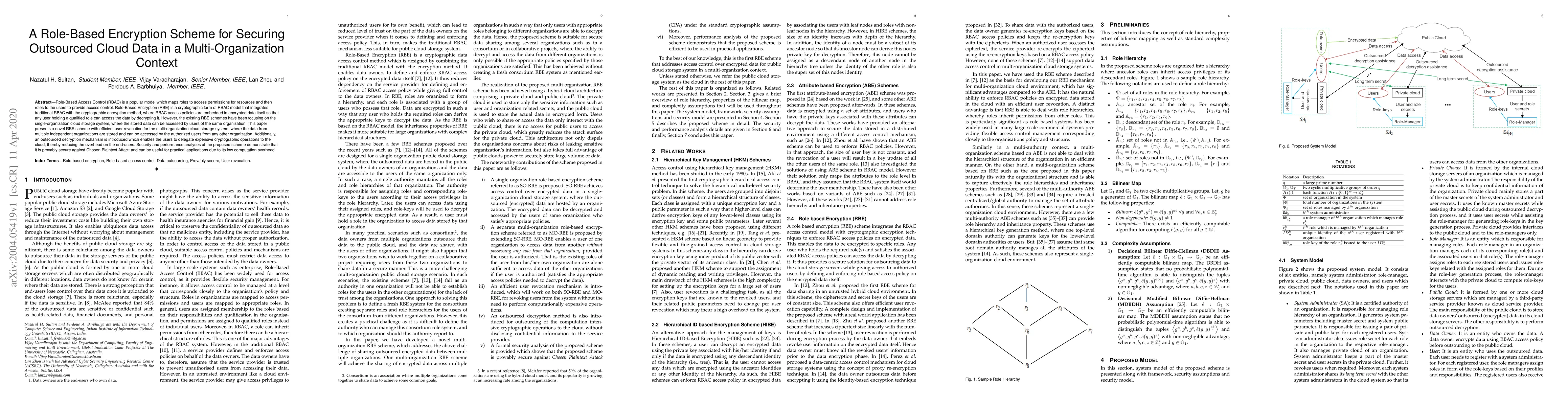 This paper introduces a role-based encryption scheme for securing outsourced cloud data in multi-organization contexts, enabling secure access control and delegated decryption with low overhead.