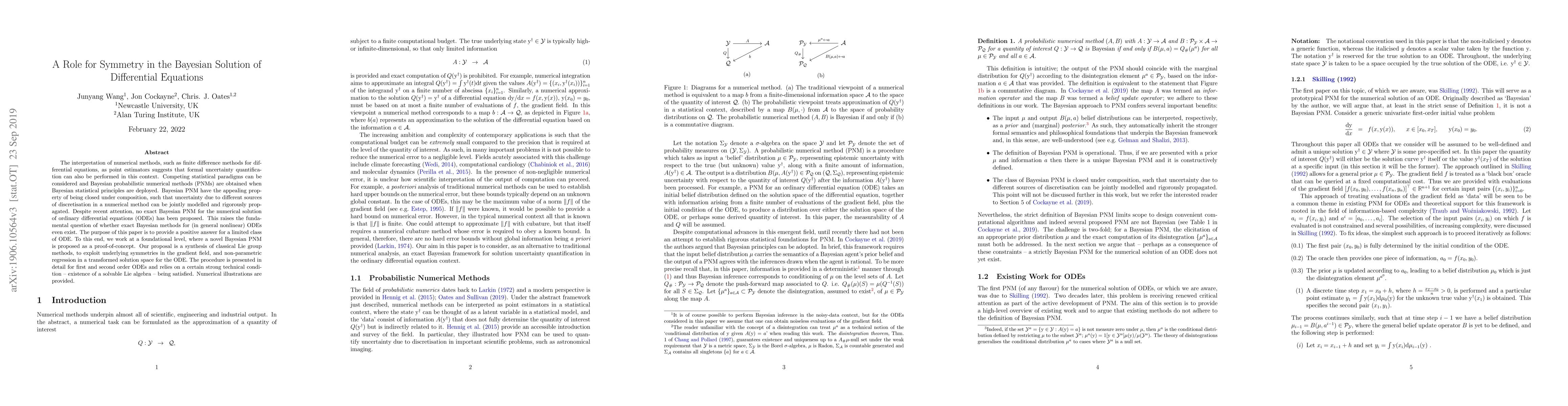The interpretation of numerical methods, such as finite difference methods for differential equations, as point estimators suggests that formal uncertainty quantification can also be performed in this context. Competing statistical paradigms can be considered and Bayesian probabilistic numerical methods (PNMs) are obtained when Bayesian statistical principles are deployed. Bayesian PNM have the appealing property of being closed under composition, such that uncertainty due to different sources of discretisation in a numerical method can be jointly modelled and rigorously propagated. Despite recent attention, no exact Bayesian PNM for the numerical solution of ordinary differential equations (ODEs) has been proposed. This raises the fundamental question of whether exact Bayesian methods for (in general nonlinear) ODEs even exist. The purpose of this paper is to provide a positive answer for a limited class of ODE. To this end, we work at a foundational level, where a novel Bayesian PNM is proposed as a proof-of-concept. Our proposal is a synthesis of classical Lie group methods, to exploit underlying symmetries in the gradient field, and non-parametric regression in a transformed solution space for the ODE. The procedure is presented in detail for first and second order ODEs and relies on a certain strong technical condition -- existence of a solvable Lie algebra -- being satisfied. Numerical illustrations are provided.