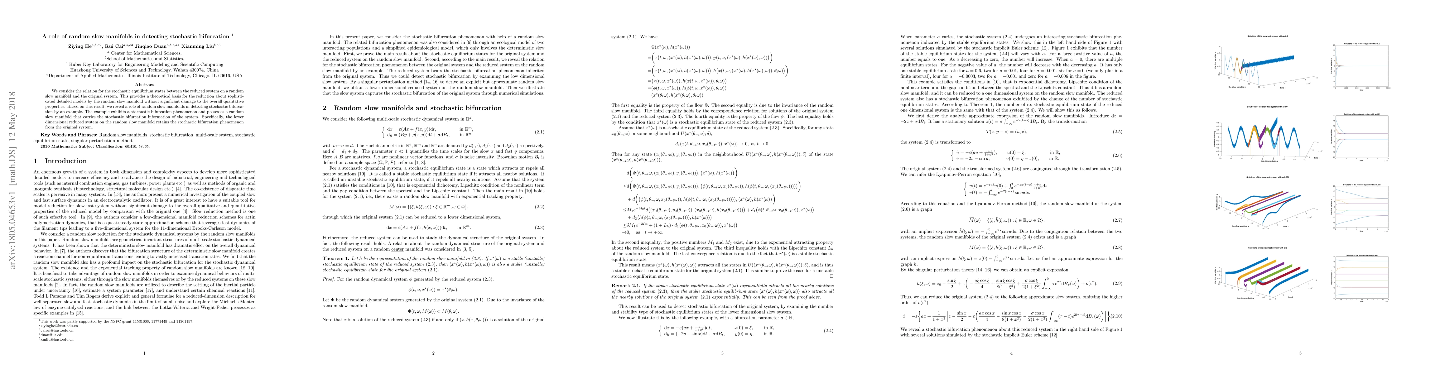 This paper examines how random slow manifolds can simplify detailed models while preserving essential qualitative properties, providing a theoretical foundation for such reductions. It also demonstrates, through an example, that random slow manifolds can detect stochastic bifurcations, as the lower-dimensional reduced system retains the bifurcation information from the original system.