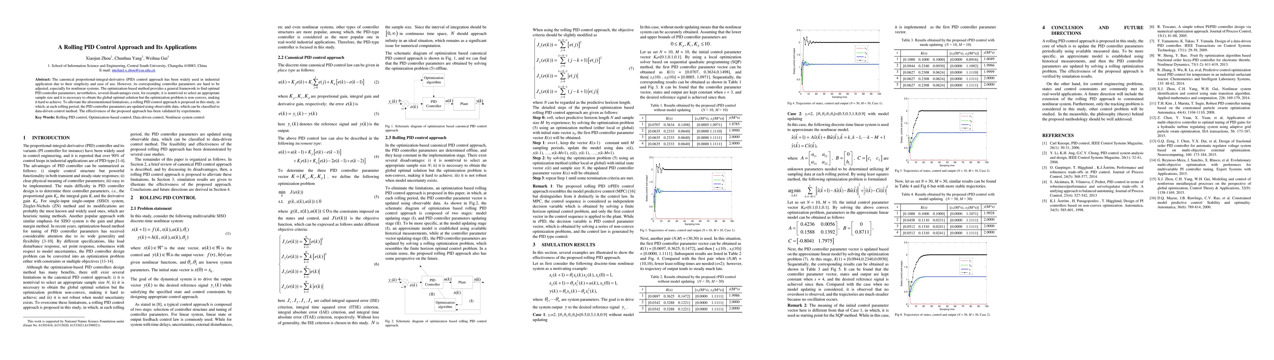 The canonical proportional-integral-derivative (PID) control approach has been widely used in industrial application due to their simplicity and ease of use. However, its corresponding controller parameters are hard to be adjusted, especially for nonlinear systems. The optimization-based method provides a general framework to find optimal PID controller parameters; nevertheless, several disadvantages exist, for example, it is nontrivial to select an appropriate sample size and it is necessary to obtain the global optimal solution but the optimization problem is non-convex, making it hard to achieve. To alleviate the aforementioned limitations, a rolling PID control approach is proposed in this study, in which, at each rolling period, the PID controller parameters are updated using observable data, which can be classified to data-driven control method. The effectiveness of the proposed approach has been validated by experiments.
