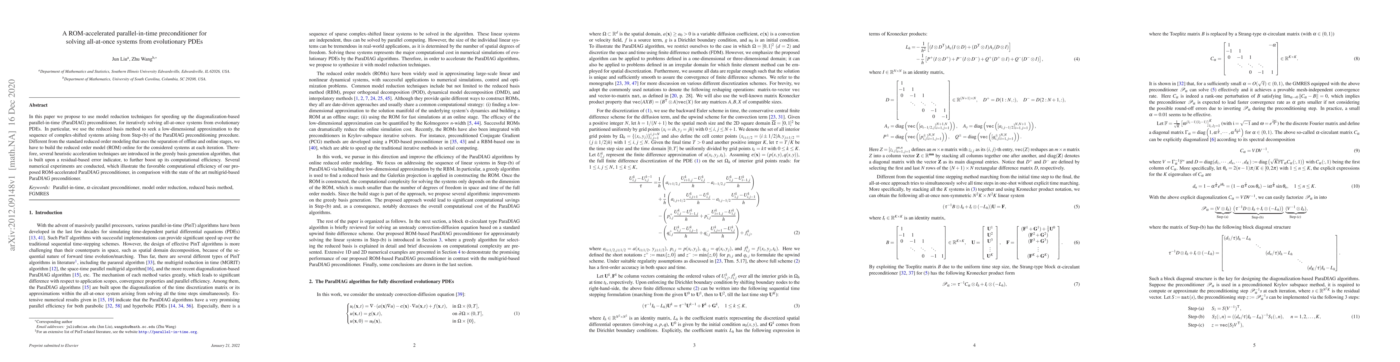 This paper proposes a ROM-accelerated parallel-in-time preconditioner for solving all-at-once systems from evolutionary PDEs, using reduced basis methods to speed up the ParaDIAG preconditioner. The online ROM construction and heuristic acceleration techniques enhance computational efficiency, outperforming the state-of-the-art multigrid-based ParaDIAG preconditioner in numerical experiments.