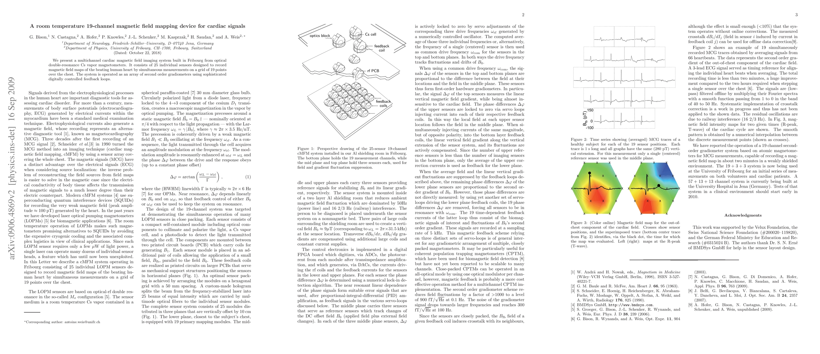 This paper introduces a 19-channel magnetic field mapping device for cardiac signals, utilizing optical double-resonance Cs vapor magnetometers in Fribourg, which records magnetic field maps of the human heart through simultaneous measurements across a grid of 19 points on the chest, employing an array of second-order gradiometers.