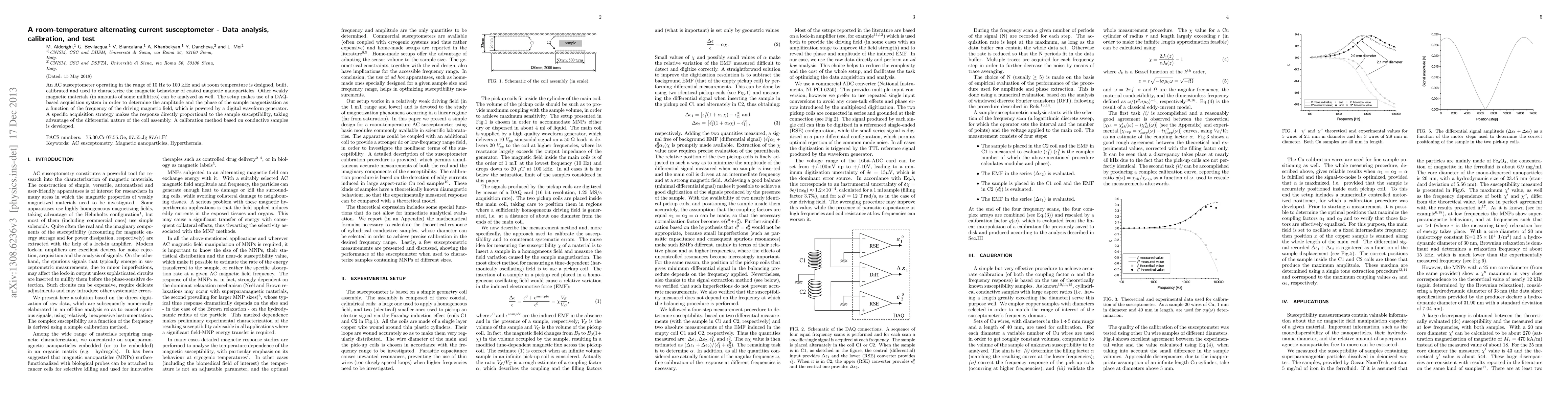 An AC susceptometer operating in the range of 10 Hz to 100 kHz and at room temperature is designed, built, calibrated and used to characterize the magnetic behaviour of coated magnetic nanoparticles. Other weakly magnetic materials (in amounts of some millilitres) can be analyzed as well. The setup makes use of a DAQ-based acquisition system in order to determine the amplitude and the phase of the sample magnetization as a function of the frequency of the driving magnetic field, which is powered by a digital waveform generator. A specific acquisition strategy makes the response directly proportional to the sample susceptibility, taking advantage of the differential nature of the coil assembly. A calibration method based on conductive samples is developed.