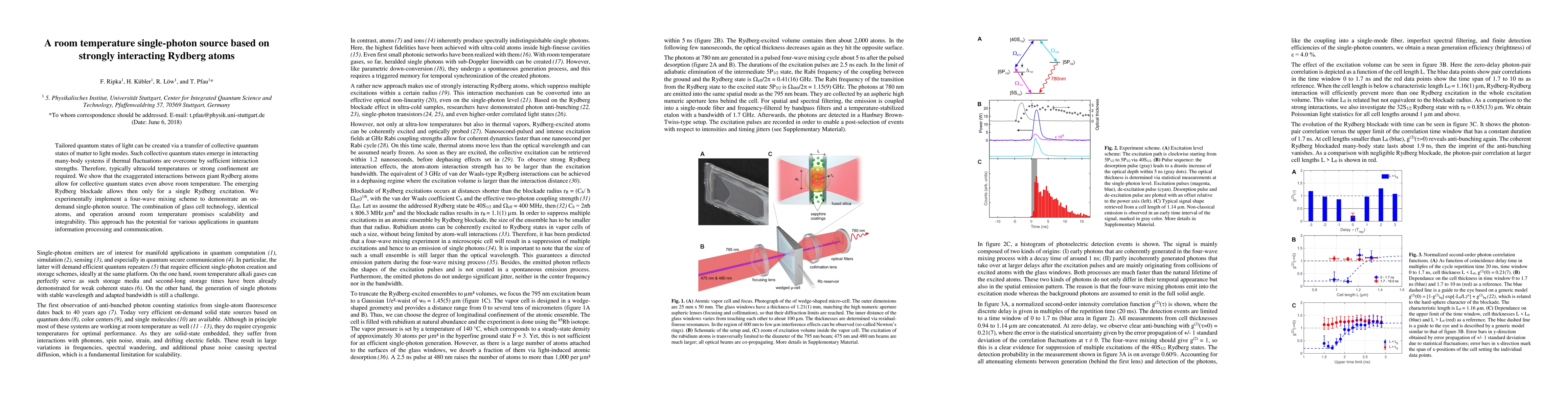 This paper demonstrates a room-temperature single-photon source utilizing strongly interacting Rydberg atoms, showing that Rydberg blockade enables a single excitation and a scalable on-demand photon source, with potential applications in quantum information processing. The approach leverages four-wave mixing in a glass cell with identical atoms, promising integrability.