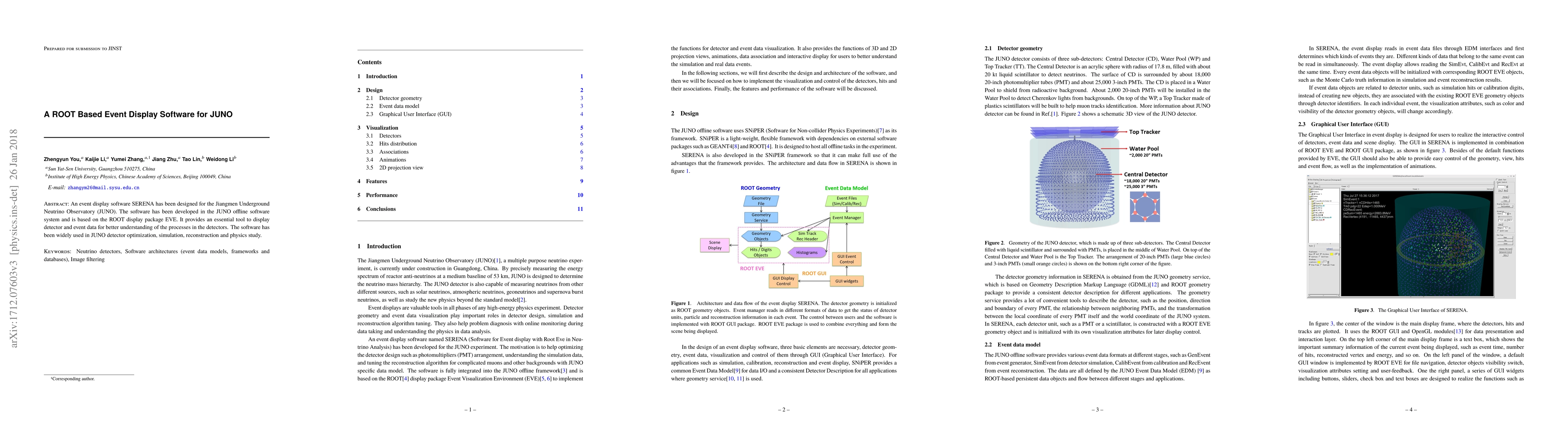 SERENA, an event display software based on ROOT's EVE package, facilitates the visualization of data for the Jiangmen Underground Neutrino Observatory (JUNO), aiding in detector optimization and physics studies. Widely utilized in JUNO's offline system, it enhances comprehension of detector processes.