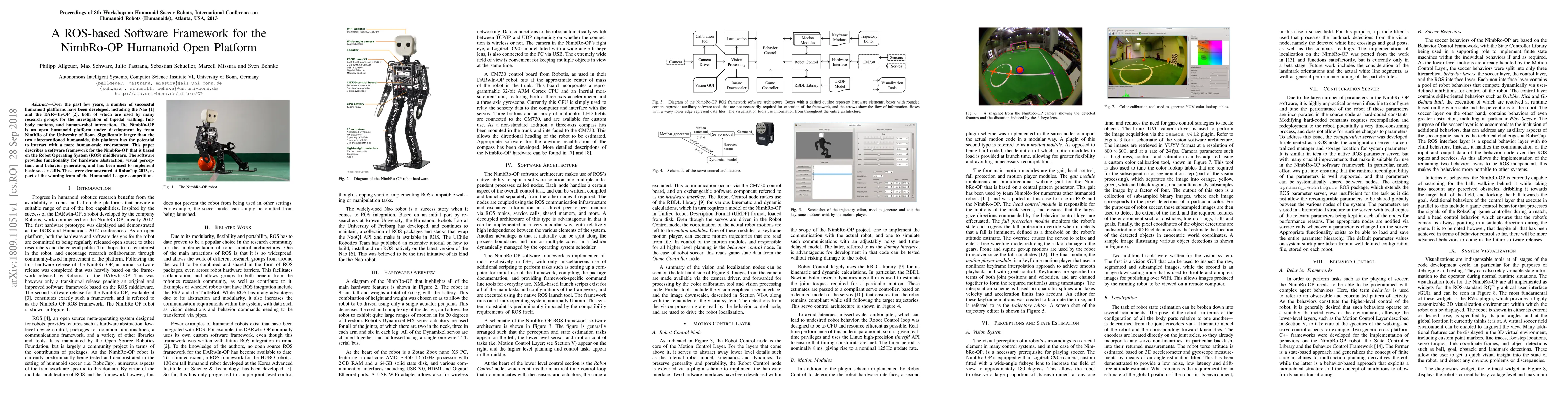 Over the past few years, a number of successful humanoid platforms have been developed, including the Nao and the DARwIn-OP, both of which are used by many research groups for the investigation of bipedal walking, full-body motions, and human-robot interaction. The NimbRo-OP is an open humanoid platform under development by team NimbRo of the University of Bonn. Significantly larger than the two aforementioned humanoids, this platform has the potential to interact with a more human-scale environment. This paper describes a software framework for the NimbRo-OP that is based on the Robot Operating System (ROS) middleware. The software provides functionality for hardware abstraction, visual perception, and behavior generation, and has been used to implement basic soccer skills. These were demonstrated at RoboCup 2013, as part of the winning team of the Humanoid League competition.
