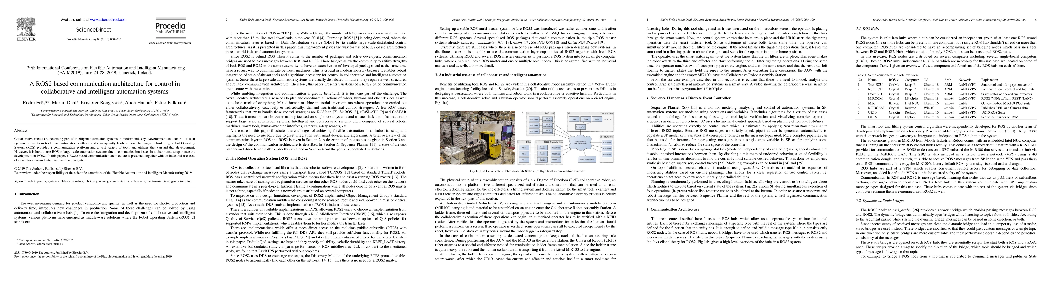 Collaborative robots are becoming part of intelligent automation systems in modern industry. Development and control of such systems differs from traditional automation methods and consequently leads to new challenges. Thankfully, Robot Operating System (ROS) provides a communication platform and a vast variety of tools and utilities that can aid that development. However, it is hard to use ROS in large-scale automation systems due to communication issues in a distributed setup, hence the development of ROS2. In this paper, a ROS2 based communication architecture is presented together with an industrial use-case of a collaborative and intelligent automation system.