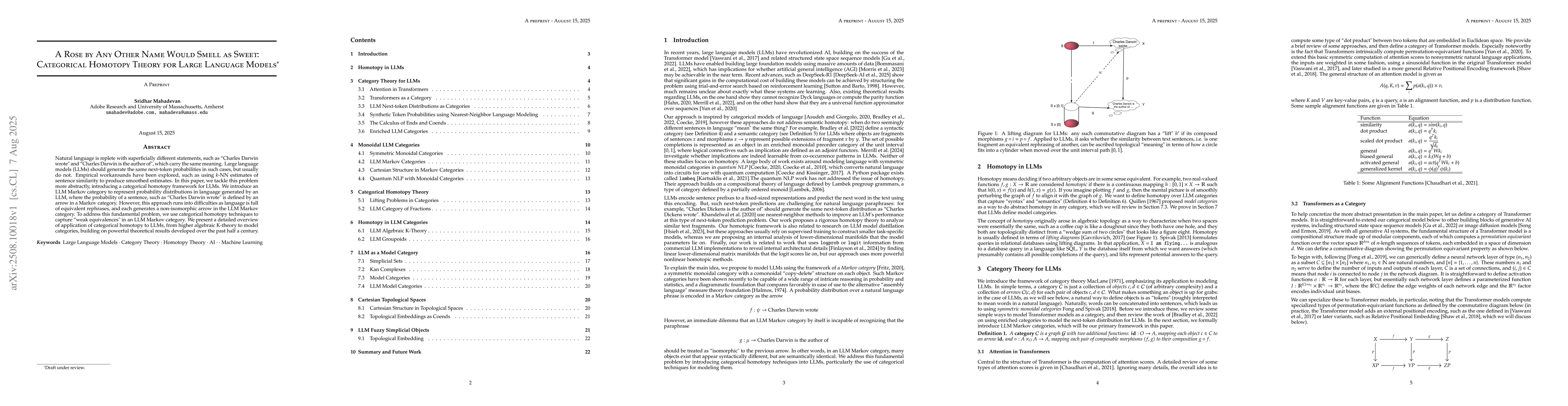 Natural language is replete with superficially different statements, such as ``Charles Darwin wrote" and ``Charles Darwin is the author of", which carry the same meaning. Large language models (LLMs) should generate the same next-token probabilities in such cases, but usually do not. Empirical workarounds have been explored, such as using k-NN estimates of sentence similarity to produce smoothed estimates. In this paper, we tackle this problem more abstractly, introducing a categorical homotopy framework for LLMs. We introduce an LLM Markov category to represent probability distributions in language generated by an LLM, where the probability of a sentence, such as ``Charles Darwin wrote" is defined by an arrow in a Markov category. However, this approach runs into difficulties as language is full of equivalent rephrases, and each generates a non-isomorphic arrow in the LLM Markov category. To address this fundamental problem, we use categorical homotopy techniques to capture ``weak equivalences" in an LLM Markov category. We present a detailed overview of application of categorical homotopy to LLMs, from higher algebraic K-theory to model categories, building on powerful theoretical results developed over the past half a century.