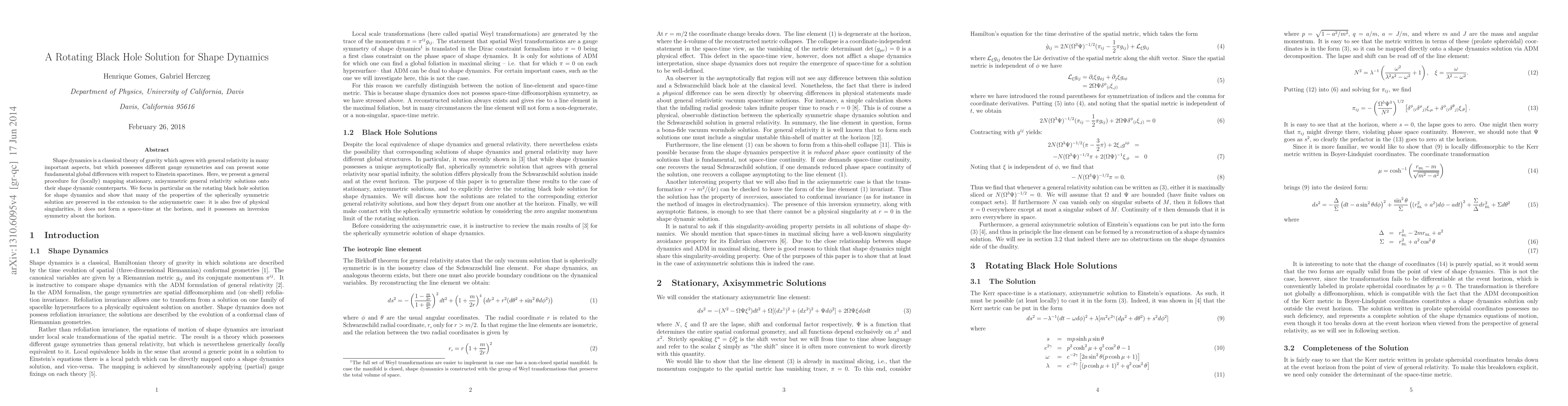 This paper presents a method to map stationary, axisymmetric general relativity solutions to their shape dynamic equivalents, focusing on the rotating black hole. The shape dynamic solution retains properties of the spherically symmetric case, including the absence of physical singularities and an inversion symmetry interpreted as a wormhole.