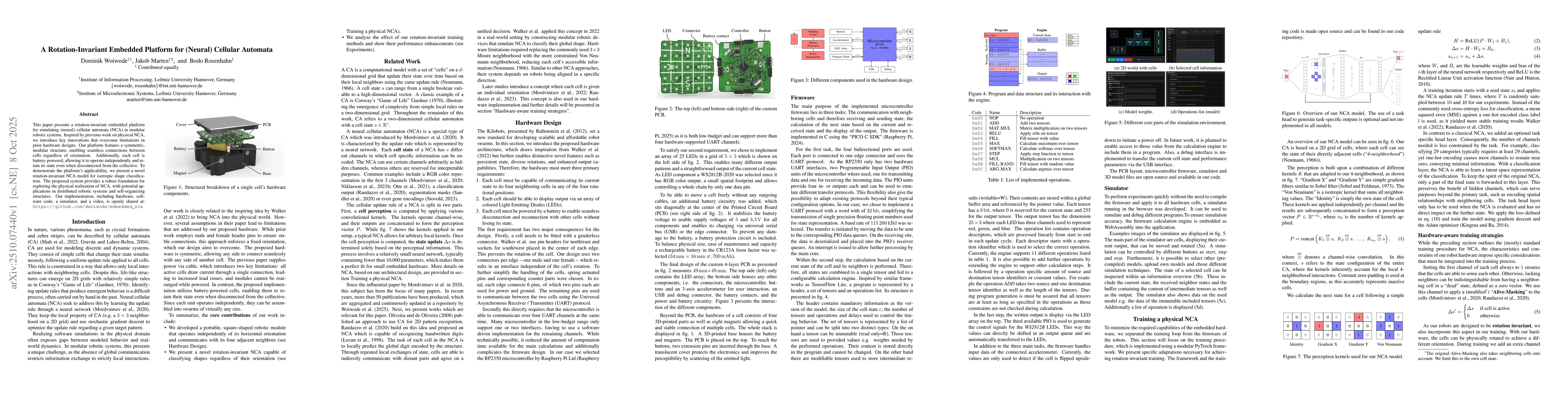The research presents a rotation-invariant embedded platform for simulating (neural) cellular automata (NCA) using a modular, symmetric hardware design with battery-powered cells. The platform integrates firmware for state communication, calculation, and LED output control, along with a simulator for testing and debugging. Training involves a hardware-aware approach with rotation-invariant perception kernels and asynchronous updates.