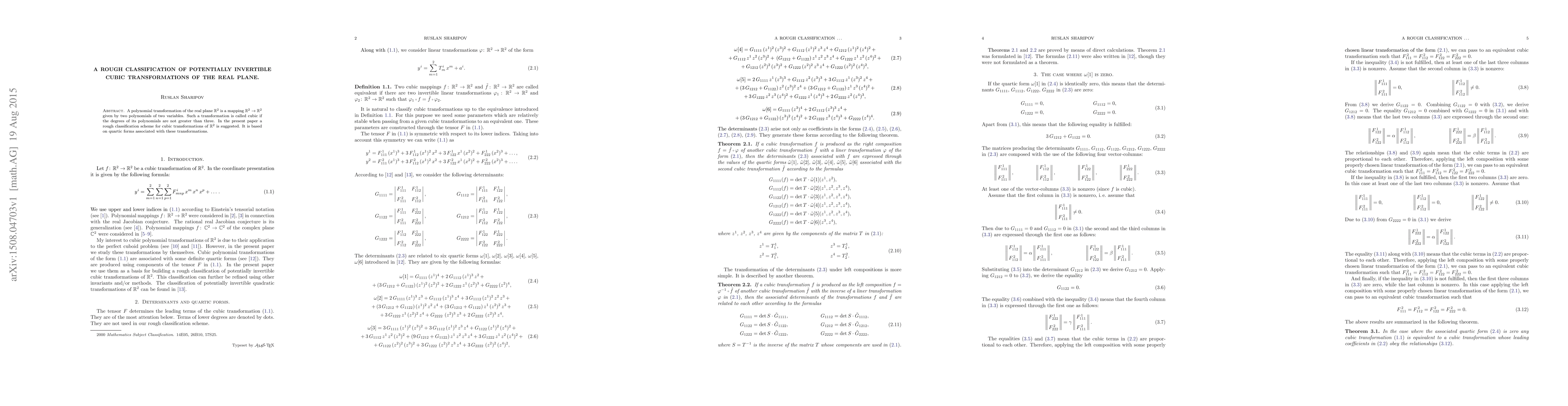 This paper proposes a classification scheme for cubic transformations of the real plane $\Bbb R^2$ based on associated quartic forms, aiming to categorize these transformations in a simplified manner. The classification focuses on the intrinsic properties of the transformations rather than specific applications.
