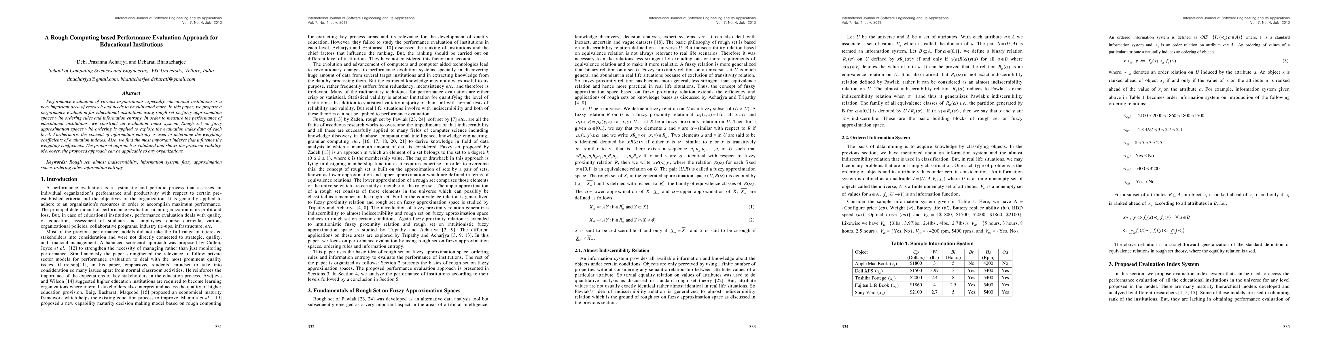 This paper proposes a performance evaluation method for educational institutions using rough set theory on fuzzy approximation spaces, ordering rules, and information entropy to determine weighting coefficients for evaluation indexes. The method identifies key performance indicators and demonstrates practical applicability for various organizations.