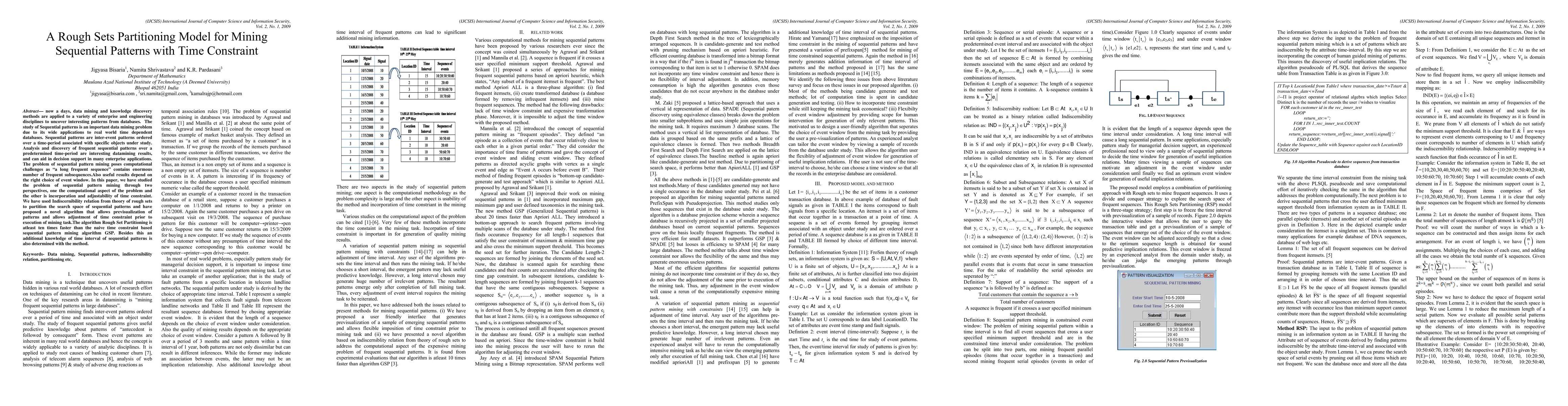 This paper proposes a Rough Sets Partitioning Model for efficient sequential pattern mining with time constraints, utilizing indiscernibility relations to partition the search space. The developed algorithm significantly outperforms existing methods, offering faster execution and the ability to adjust time constraints before mining.