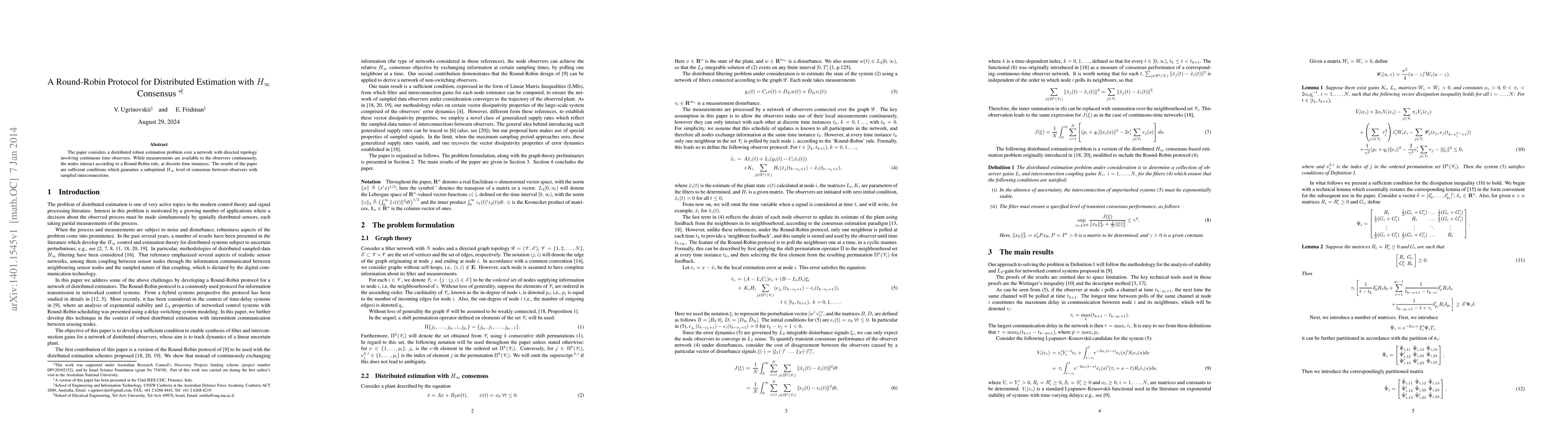 The paper proposes a Round-Robin protocol for distributed estimation in networks with directed topology, ensuring a suboptimal $H_\infty$ consensus level among continuous time observers that interact at discrete time intervals. The protocol guarantees robust estimation despite sampled interconnections.