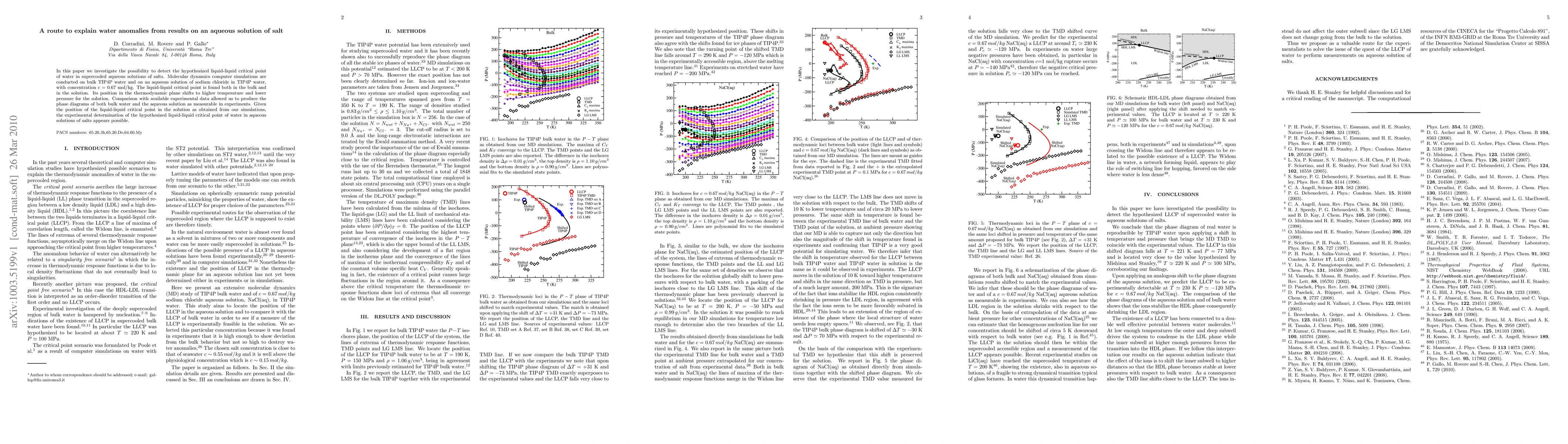 This paper uses molecular dynamics simulations to investigate the liquid-liquid critical point in supercooled water and salt solutions, finding its position shifts in the solution. The study suggests that experimental determination of this critical point in aqueous salt solutions is feasible.