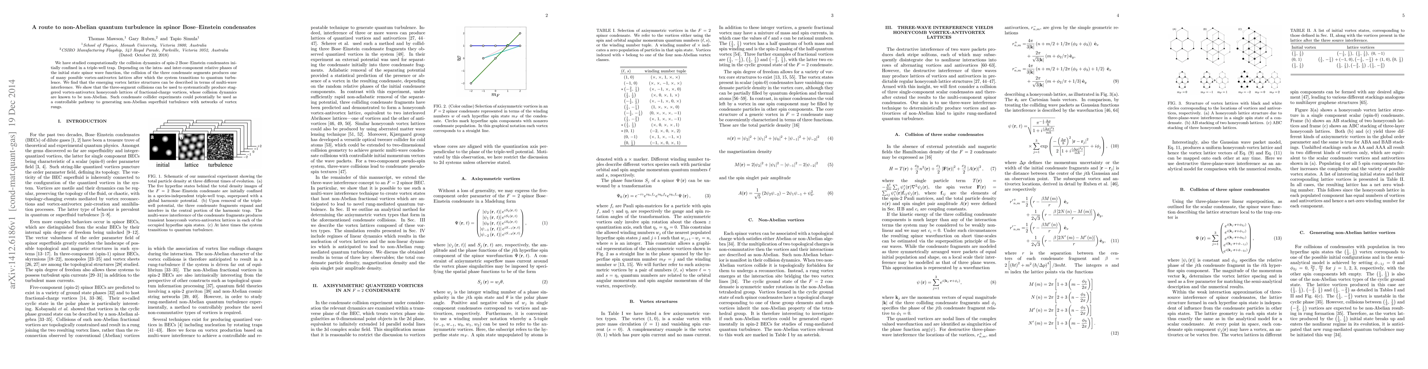 We have studied computationally the collision dynamics of spin-2 Bose--Einstein condensates initially confined in a triple-well trap. Depending on the intra- and inter-component relative phases of the initial state spinor wave function, the collision of the three condensate segments produces one of many possible vortex-antivortex lattices after which the system transitions to quantum turbulence. We find that the emerging vortex lattice structures can be described in terms of multi-wave interference. We show that the three-segment collisions can be used to systematically produce staggered vortex-antivortex honeycomb lattices of fractional-charge vortices, whose collision dynamics are known to be non-Abelian. Such condensate collider experiments could potentially be used as a controllable pathway to generating non-Abelian superfluid turbulence with networks of vortex rungs.