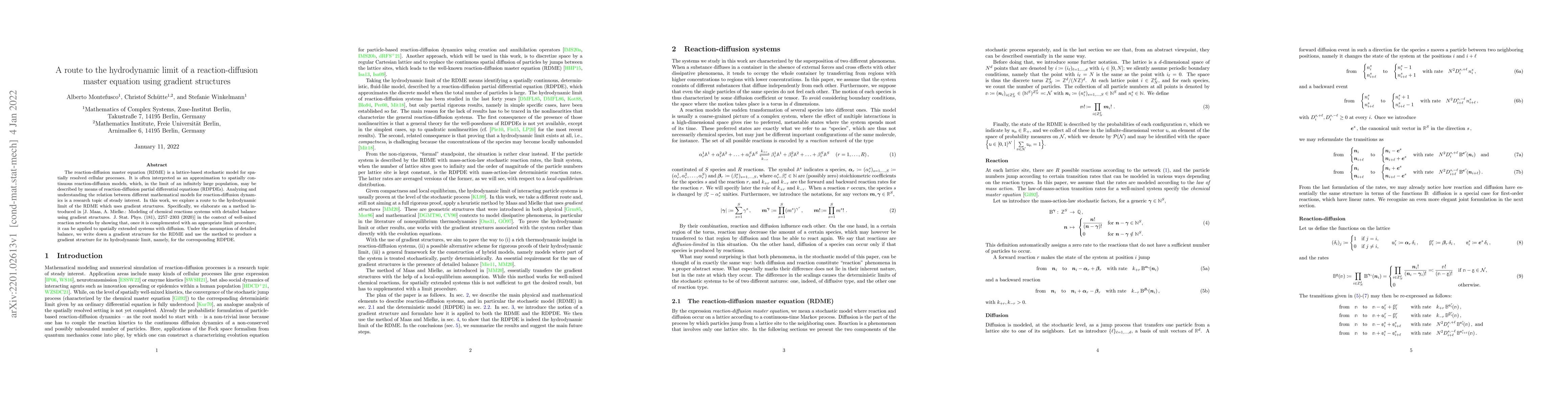This paper explores a method to derive the hydrodynamic limit of the reaction-diffusion master equation (RDME) using gradient structures, extending a previously introduced technique to spatially extended systems with diffusion. The authors demonstrate that this method, when combined with an appropriate limit procedure, can bridge RDME and reaction-diffusion partial differential equations (RDPDEs) under detailed balance.
