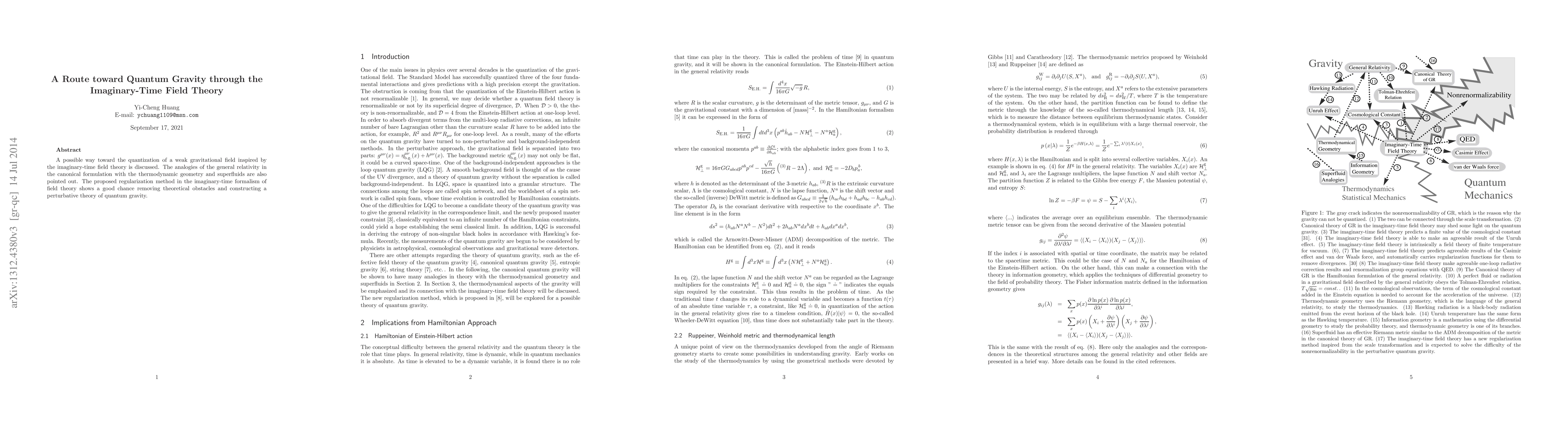 A possible way toward the quantization of a weak gravitational field inspired by the imaginary-time field theory is discussed. The analogies of the general relativity in the canonical formulation with the thermodynamic geometry and superfluids are also pointed out. The proposed regularization method in the imaginary-time formalism of field theory shows a good chance removing theoretical obstacles and constructing a perturbative theory of quantum gravity.