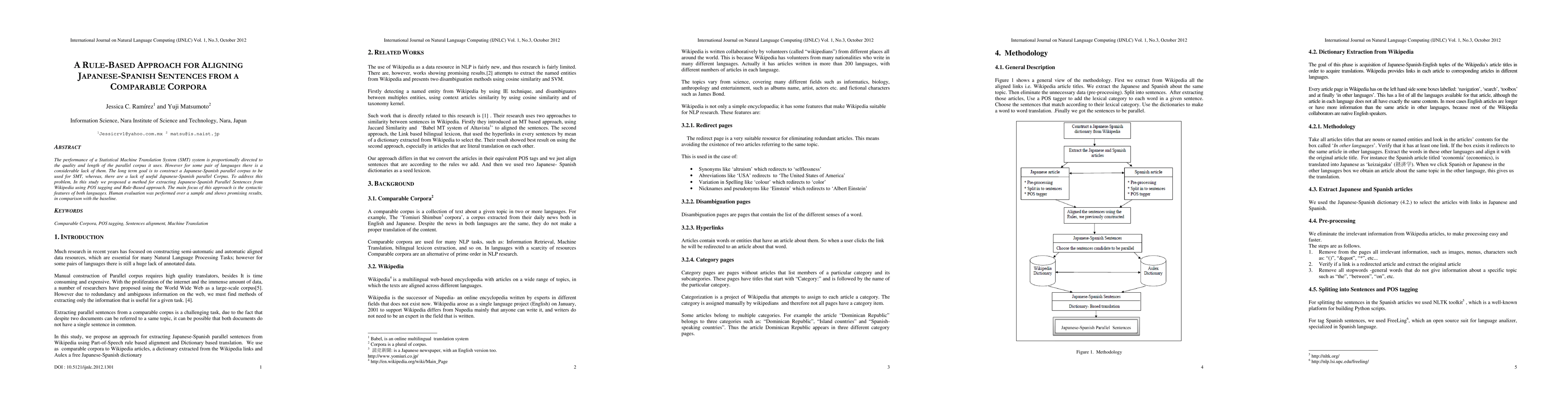 This study proposes a rule-based method to extract Japanese-Spanish parallel sentences from Wikipedia using POS tagging, focusing on syntactic features. Human evaluation indicates promising results compared to baselines, aiming to construct a Japanese-Spanish parallel corpus for Statistical Machine Translation.