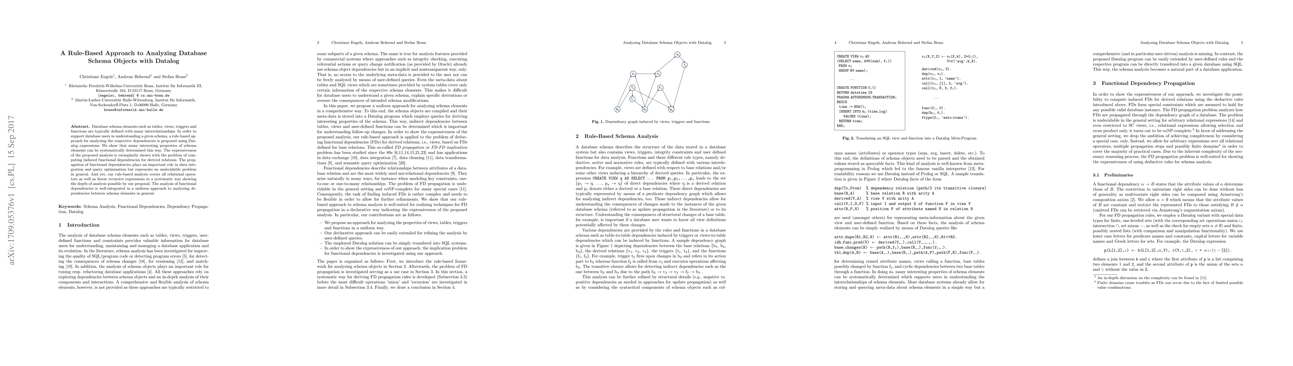 This paper proposes a rule-based approach using Datalog to analyze dependencies between database schema objects like tables, views, triggers, and functions. It demonstrates the method's effectiveness in systematically determining properties such as induced functional dependencies, crucial for data integration and query optimization.