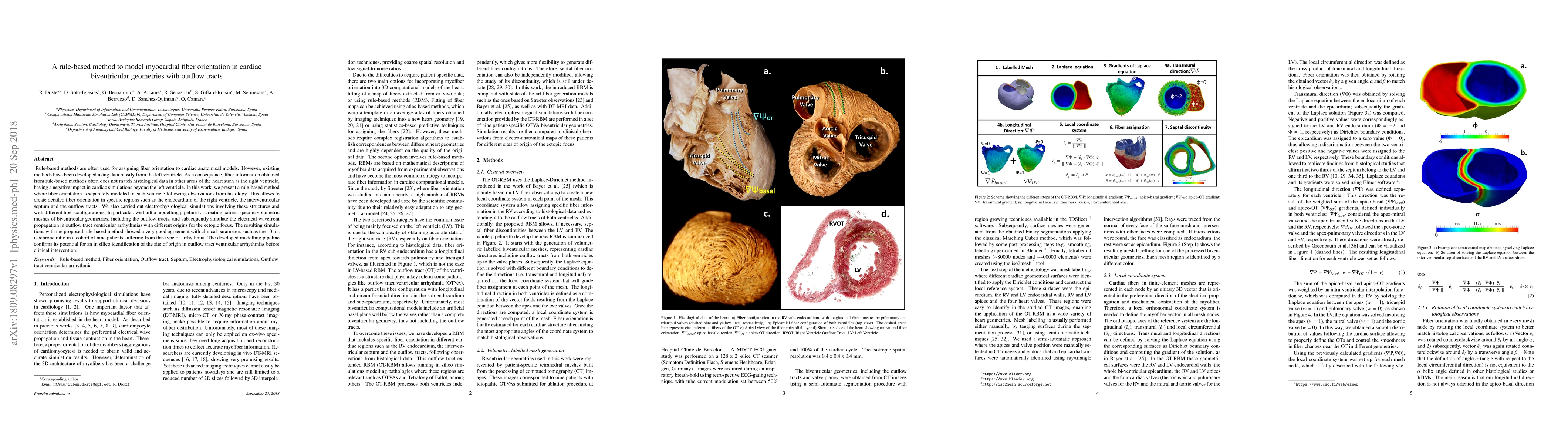 Rule-based methods are often used for assigning fiber orientation to cardiac anatomical models. However, existing methods have been developed using data mostly from the left ventricle. As a consequence, fiber information obtained from rule-based methods often does not match histological data in other areas of the heart such as the right ventricle, having a negative impact in cardiac simulations beyond the left ventricle. In this work, we present a rule-based method where fiber orientation is separately modeled in each ventricle following observations from histology. This allows to create detailed fiber orientation in specific regions such as the endocardium of the right ventricle, the interventricular septum and the outflow tracts. We also carried out electrophysiological simulations involving these structures and with different fiber configurations. In particular, we built a modelling pipeline for creating patient-specific volumetric meshes of biventricular geometries, including the outflow tracts, and subsequently simulate the electrical wavefront propagation in outflow tract ventricular arrhythmias with different origins for the ectopic focus. The resulting simulations with the proposed rule-based method showed a very good agreement with clinical parameters such as the 10 ms isochrone ratio in a cohort of nine patients suffering from this type of arrhythmia. The developed modelling pipeline confirms its potential for an in silico identification of the site of origin in outflow tract ventricular arrhythmias before clinical intervention.