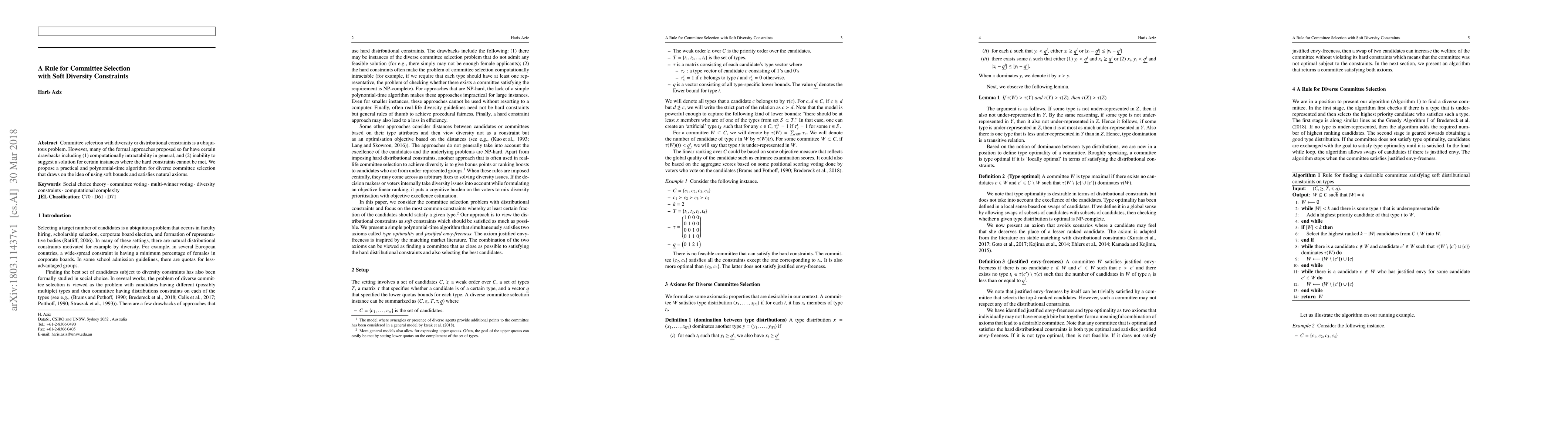 This paper proposes a polynomial-time algorithm for selecting diverse committees using soft diversity constraints, addressing computational intractability and the inability to find solutions for instances where hard constraints fail. The method leverages soft bounds to satisfy natural selection axioms.