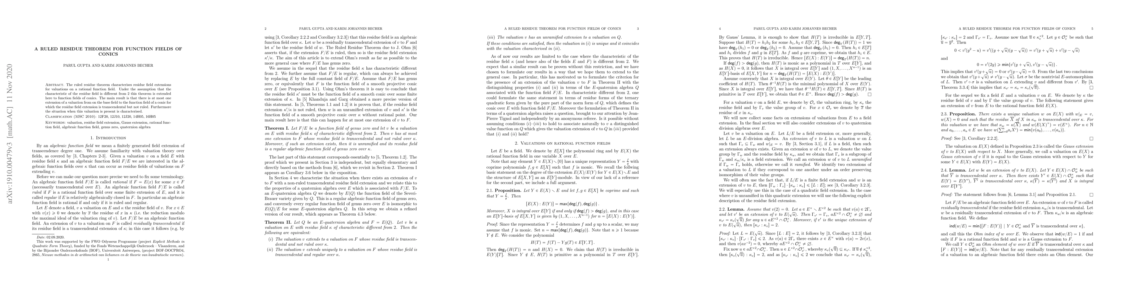 This paper extends the ruled residue theorem to function fields of conics, proving that there is at most one valuation extension with a transcendental residue field extension that is not ruled, and characterizes this exceptional situation when it occurs.