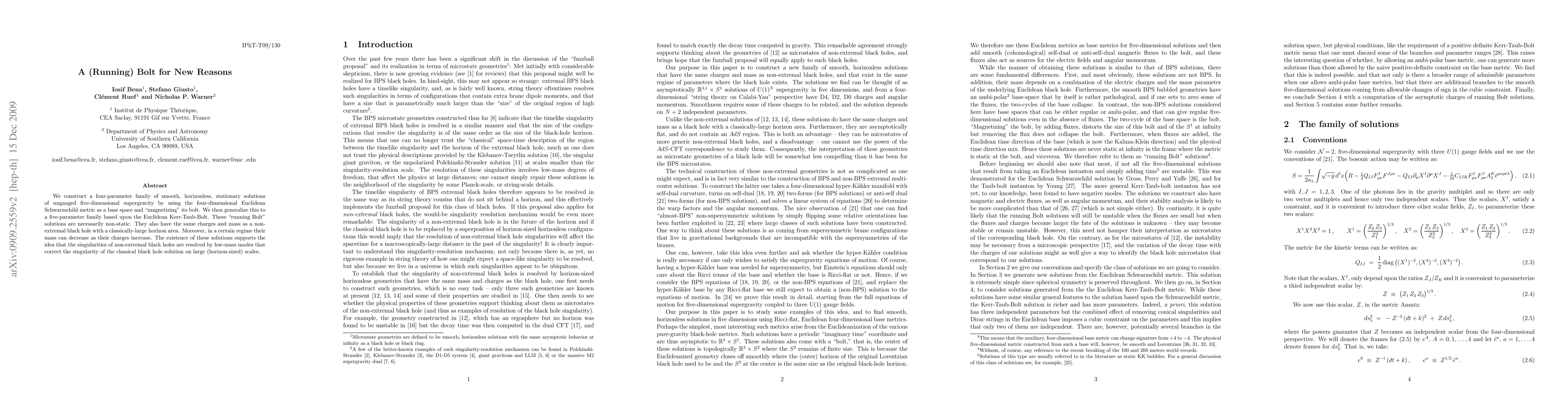 This paper presents a four-parameter family of horizonless, stationary solutions in five-dimensional supergravity derived from the Euclidean Schwarzschild metric, and generalizes it to a five-parameter family based on the Euclidean Kerr-Taub-Bolt. These "running Bolt" solutions exhibit decreasing mass with increasing charges, supporting the idea that non-extremal black hole singularities are resolved by low-mass modes.