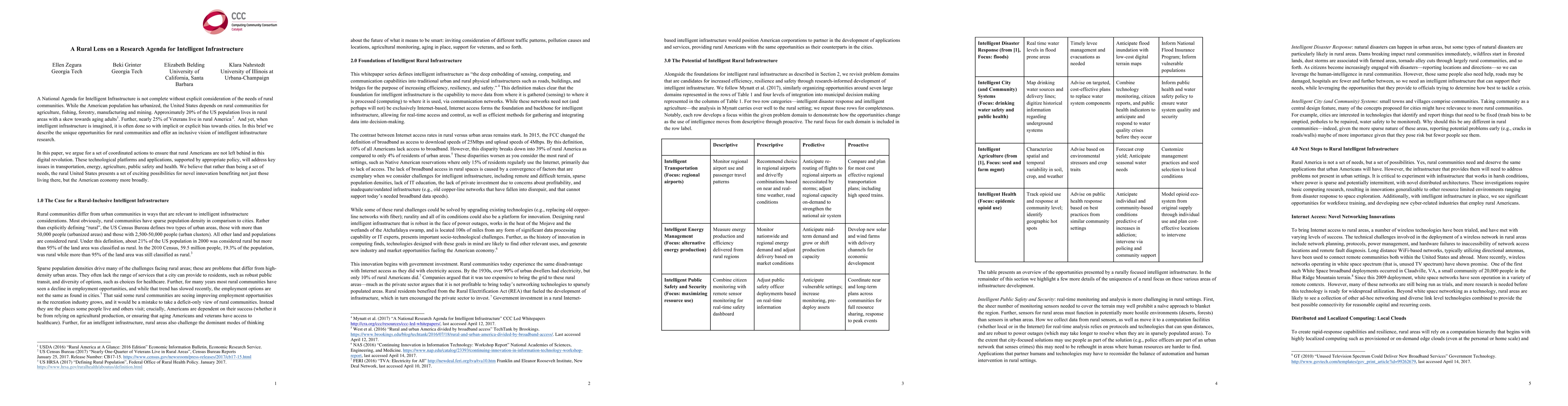 A National Agenda for Intelligent Infrastructure is not complete without explicit consideration of the needs of rural communities. While the American population has urbanized, the United States depends on rural communities for agriculture, fishing, forestry, manufacturing and mining. Approximately 20% of the US population lives in rural areas with a skew towards aging adults. Further, nearly 25% of Veterans live in rural America. And yet, when intelligent infrastructure is imagined, it is often done so with implicit or explicit bias towards cities. In this brief we describe the unique opportunities for rural communities and offer an inclusive vision of intelligent infrastructure research. In this paper, we argue for a set of coordinated actions to ensure that rural Americans are not left behind in this digital revolution. These technological platforms and applications, supported by appropriate policy, will address key issues in transportation, energy, agriculture, public safety and health. We believe that rather than being a set of needs, the rural United States presents a set of exciting possibilities for novel innovation benefiting not just those living there, but the American economy more broadly