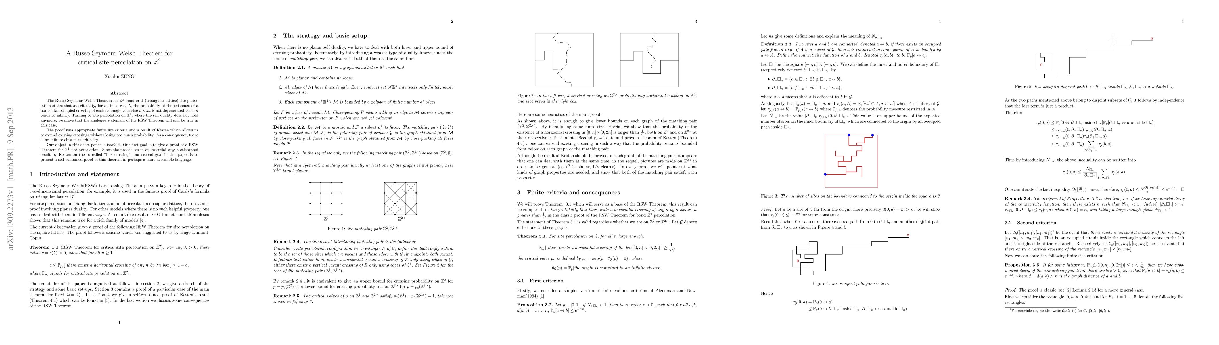 This paper proves the Russo-Seymour-Welsh Theorem for critical site percolation on \(\mathbb{Z}^2\), showing that at criticality, the probability of a horizontal crossing in a rectangle of size \(n\lambda n\) does not degenerate as \(n\) tends to infinity. It also provides a self-contained proof of Kesten's "box crossing" theorem to support the result.