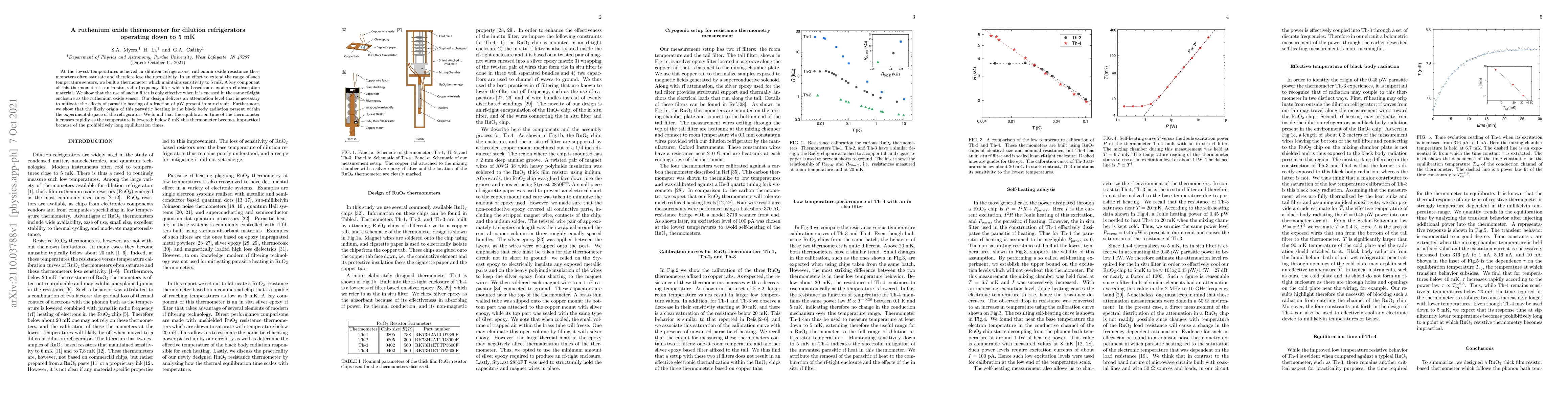 At the lowest temperatures achieved in dilution refrigerators, ruthenium oxide resistance thermometers often saturate and therefore lose their sensitivity. In an effort to extend the range of such temperature sensors, we built a thermometer which maintains sensitivity to 5~mK. A key component of this thermometer is an in situ radio frequency filter which is based on a modern rf absorption material. We show that the use of such a filter is only effective when it is encased in the same rf-tight enclosure as the ruthenium oxide sensor. Our design delivers an attenuation level that is necessary to mitigate the effects of parasitic heating of a fraction of pW present in our circuit. Furthermore, we show that the likely origin of this parasitic heating is the black body radiation present within the experimental space of the refrigerator. We found that the equilibration time of the thermometer increases rapidly as the temperature is lowered; below 5~mK this thermometer becomes impractical because of the prohibitively long equilibration times.